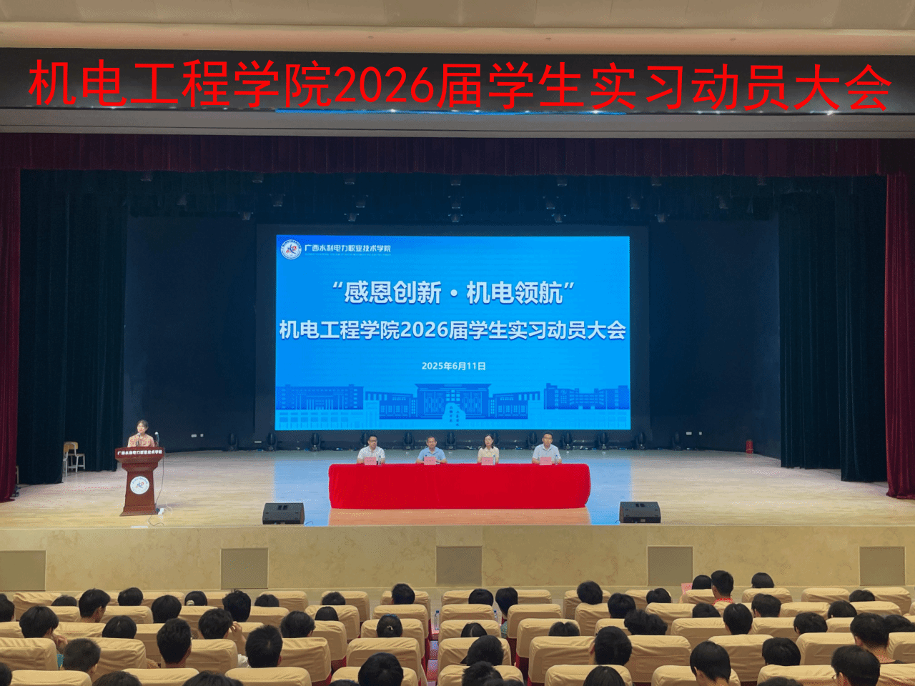 [本网讯]为切实做好学生实习组织工作,帮助学生树立科学合理的就业观念,6月11日晚,机电工程学院在里建校区大学生活动中心召开2026届学生岗位实习动员大会。机电工程学院院长陆尚平,党总支书记杨青,副院长陈韶光、季锐出席会议,学务干事、团委负责人、2026届辅导员及全体2026届学生参加会议。会议由机电工程学院“匠心志远”辅导员工作室成员林超主持。
