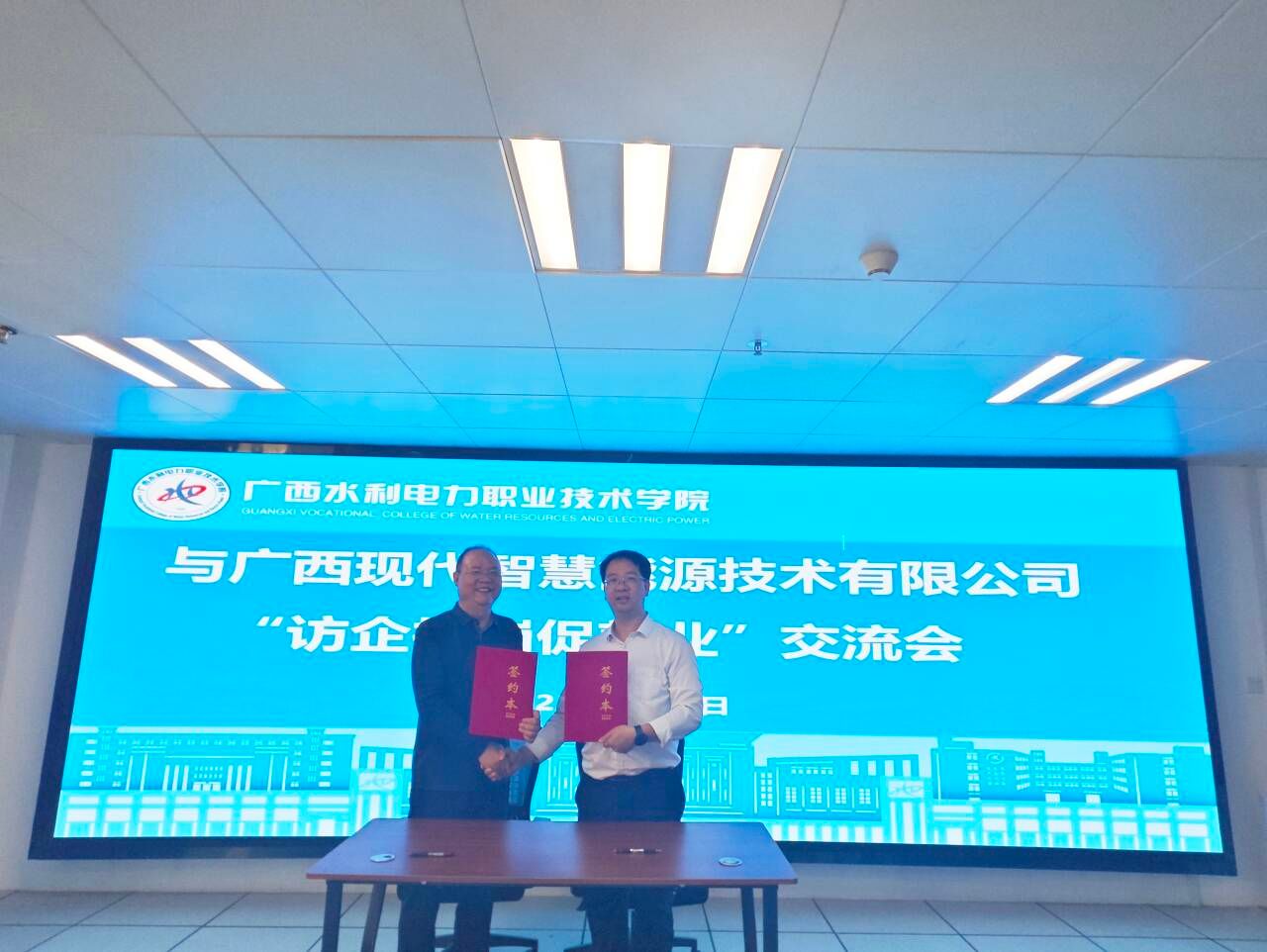 会上,双方围绕广西区内小水电绿色改造、智能化建设、“人工智能+”典型应用案例、人才培养模式创新以及学生就业精准对接等议题展开深入交流并达成多项共识,正式签订校企合作框架协议。随后,周涛为史堂元颁发产业学院产业导师聘书,标志着校企“双元育人”机制迈出坚实一步。