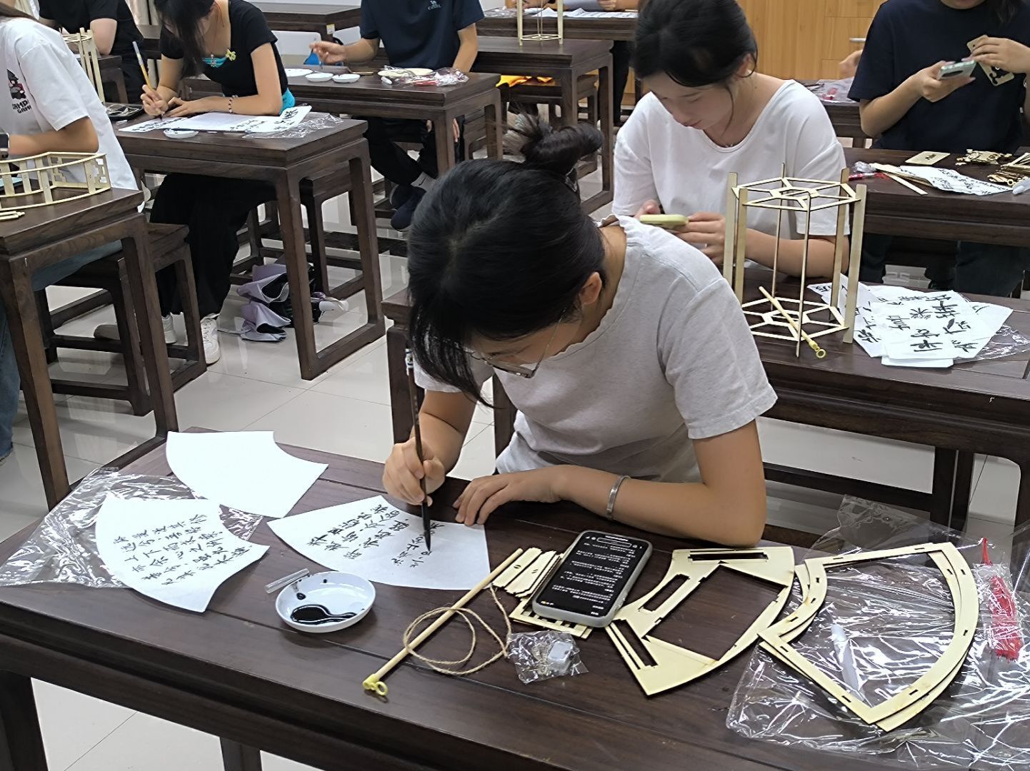 宫灯制作过程中,同学们互帮互助、交流经验,现场洋溢着欢声笑语。从搭建宫灯骨架,到粘贴宣纸,再到装饰点缀,大家精心雕琢,将普通材料变成了一盏盏精美的书法宫灯。当宫灯亮起,柔和的灯光透过宣纸,映照出苍劲有力的书法字迹,整个活动现场沉浸在温馨、祥和的节日氛围之中。