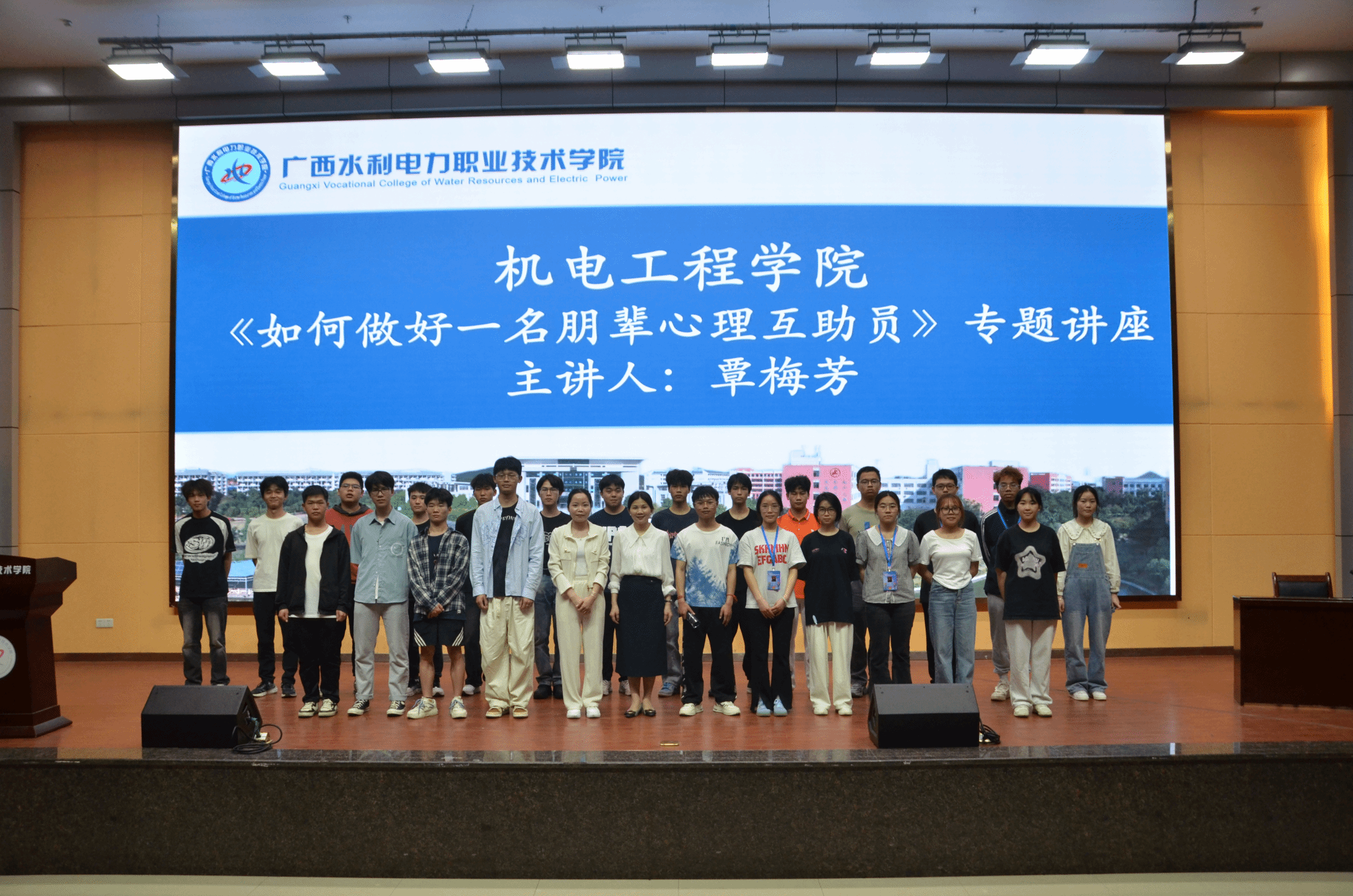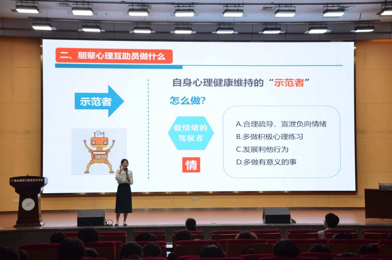 [本网讯]为进一步提升朋辈心理互助员的专业素养与实操能力,筑牢校园心理健康防线,3月25日晚,机电工程学院心理辅导站在里建校区青年之家学术报告厅举办了“如何做好一名朋辈心理互助员”专题讲座。此次讲座邀请广西财经学院覃梅芳副教授担任主讲嘉宾,学院心理站站长庞玉兰、专职辅导员黄彬峰以及各年级心理委员、宿舍联络员等450余名心理骨干到场聆听。