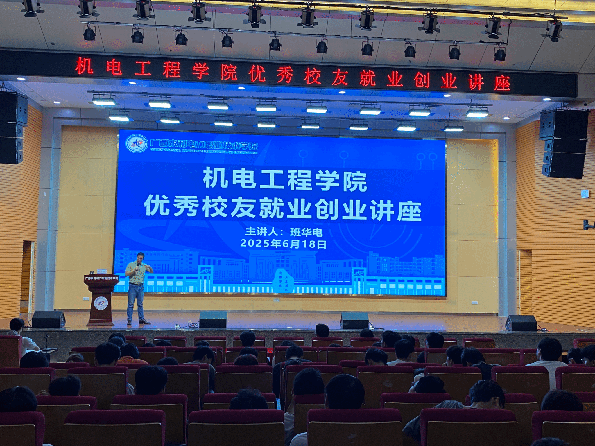 [本网讯]为深化产教融合,助力学子职业发展,充分发挥校友榜样的引领示范作用,6月18日晚,机电工程学院邀请2001届杰出校友、广西徐沃工程机械设备有限公司创始人兼总经理班华电,在青年之家学术报告厅举办就业创业主题讲座。机电工程学院副院长季锐、教师代表、专职辅导员及500余名学生参加此次讲座,讲座由“匠心志远”辅导员工作室成员林超主持。