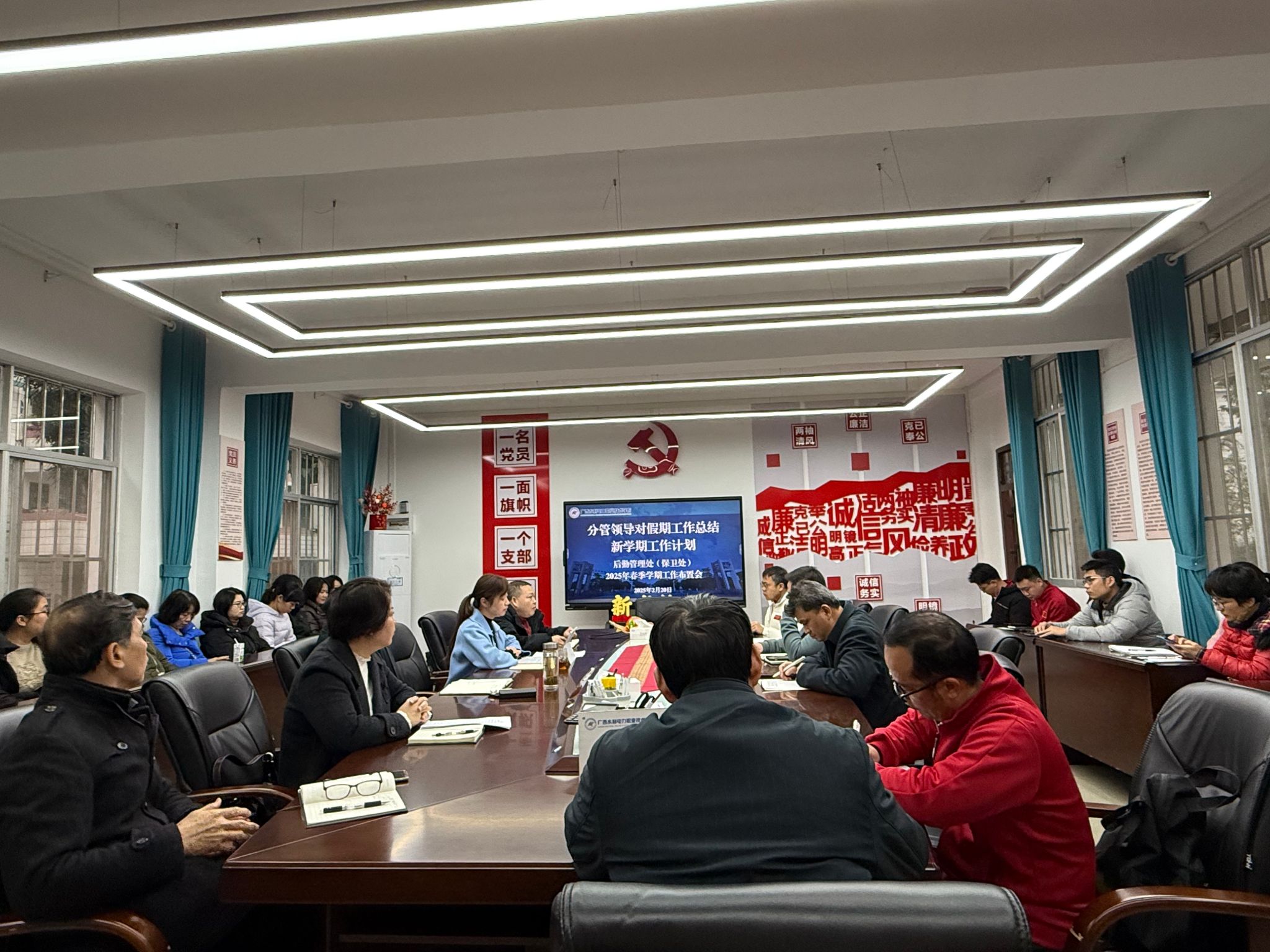 接着,后勤处领导班子分别就分管领域对寒假期间的工作情况进行总结,并对2025年春季学期开学前的各项准备工作进行了具体布置,重点围绕部门预算执行、校园建设、水电保障与维修、交通运行保障、校园安全保卫、食堂食品安全、卫生医疗救护等关键领域,强调要全力保障新学期校园各项工作平稳运行。