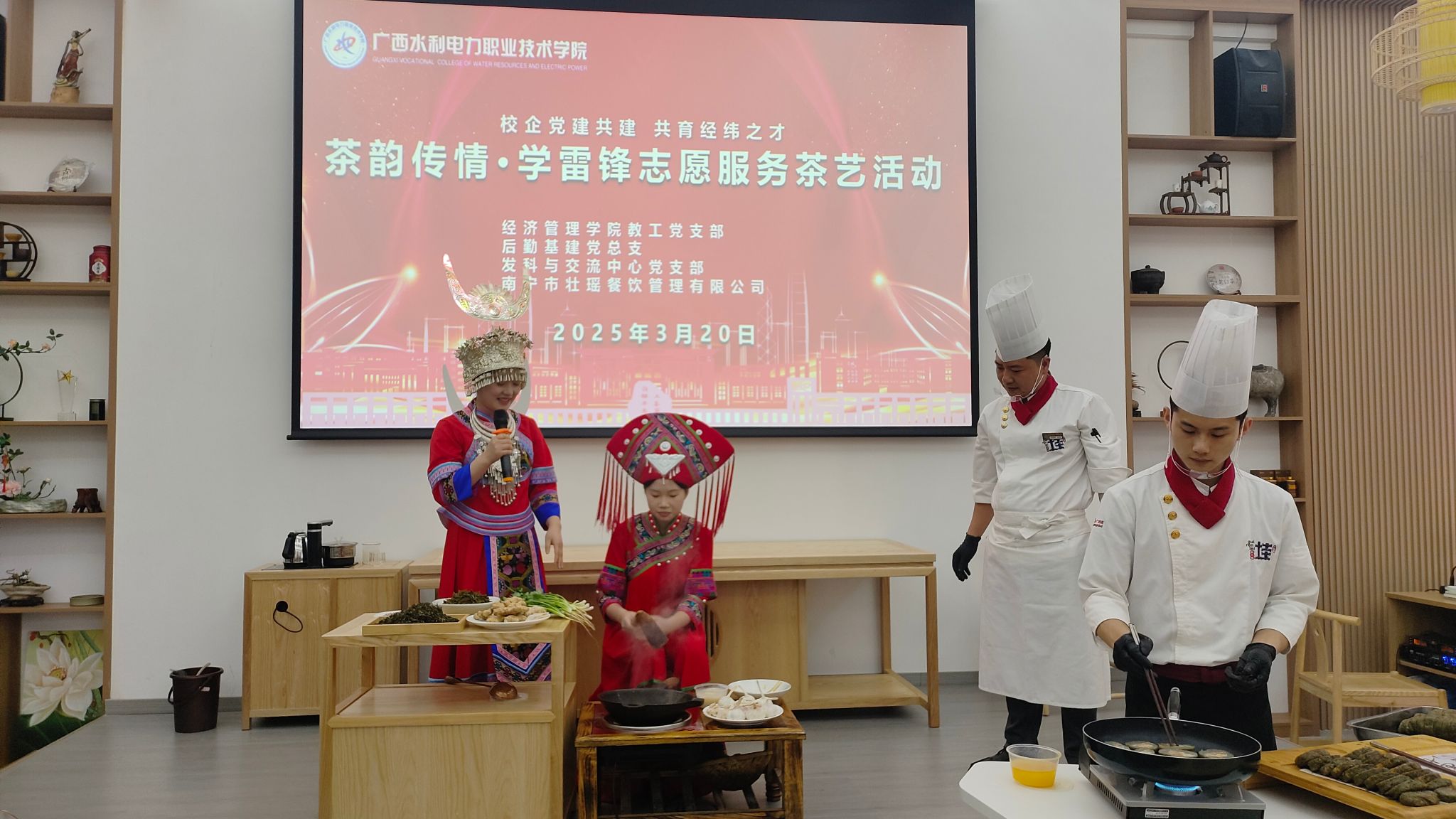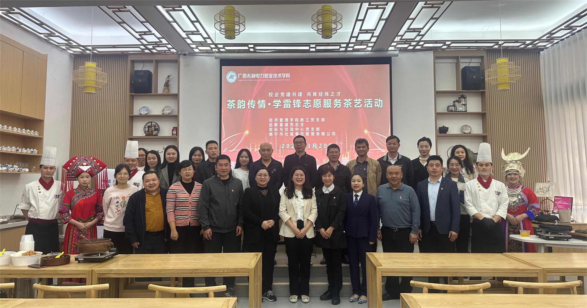 [本网讯]三月,春风拂面,万物复苏。为弘扬雷锋精神,传承中华优秀传统文化,3月20日下午,经管学院教工党支部联合后勤基建党总支、发科与交流中心党支部携手南宁市壮瑶餐饮管理有限公司在经管实训楼茶艺实训室举办“三月春风暖,茶香伴雷锋”主题党日活动。