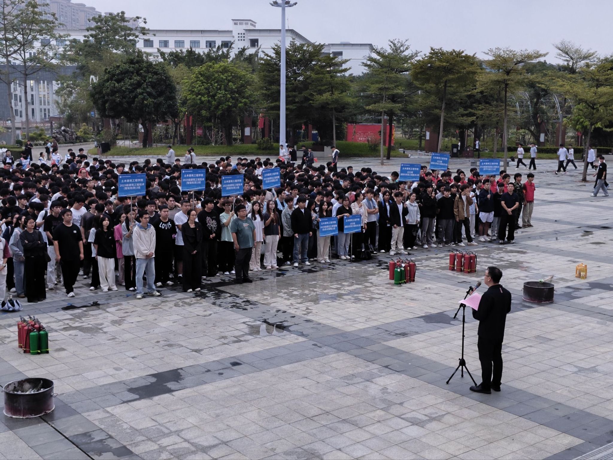 后勤基建党总支和土木建筑工程学院党总支党员教师代表和933名新生共同参加演练。(韦江雪/文 梁中超/图)