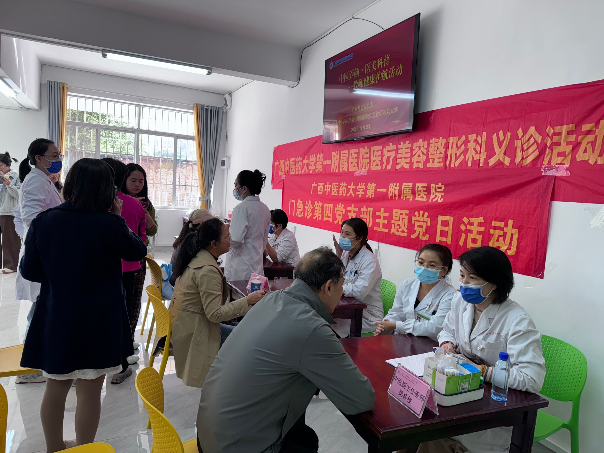 [本网讯]11月28日下午,学校后勤基建党总支携手广西中医药大学第一附属医院门急诊第四党支部,在长堽校区红豆轩食堂一楼开展 “我为群众办实事”主题义诊活动。活动以党建为引领,充分发挥跨单位资源联动优势,将优质医疗健康服务精准送到全体教职工(含退休职工)及家属身边,用实际行动守护校园健康福祉。