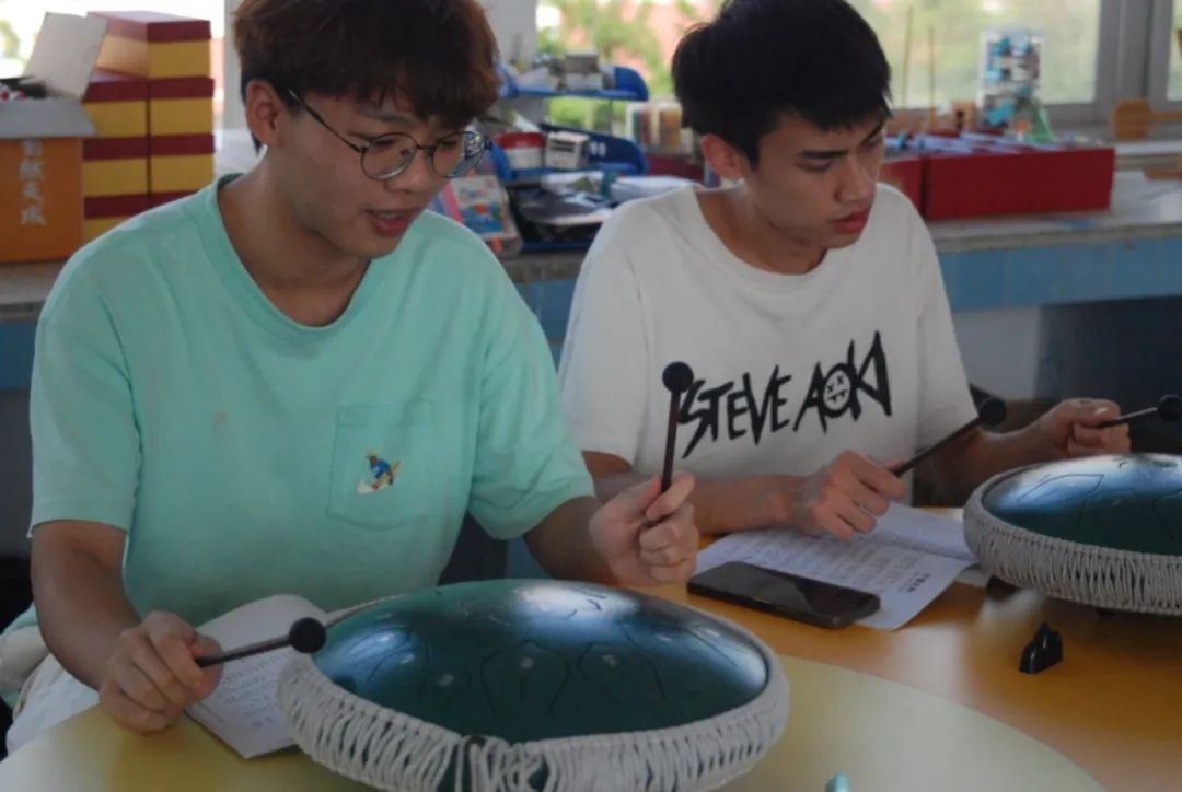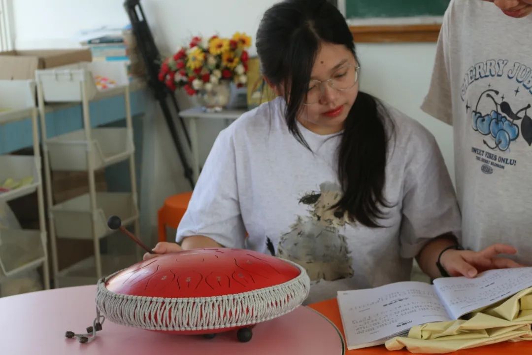 这三期活动中大家的参与热情十分高涨,现场气氛热烈。同学们通过教学曲谱学习了空灵鼓的基本演奏技巧,并通过团队合作完成了几首曲目的演奏。每个人轻轻敲击鼓面,从最初的小心翼翼到逐渐熟练,简单的音符组合成一首首动人的旋律,如潺潺流水般在空气中流淌。在活动中,同学们不仅体验到了音乐的魅力,也在敲击空灵鼓的过程中释放了压力,感受到了内心的平静,同时也在集体演奏中感受到了团队的力量。