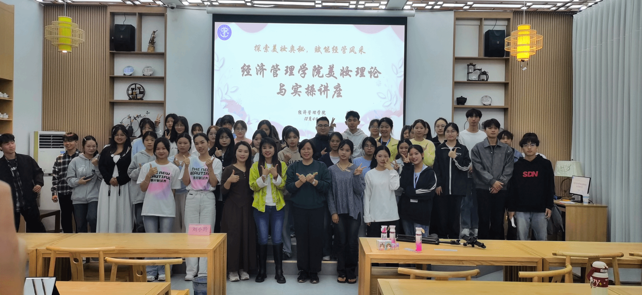 [本网讯]为丰富校园文化生活,提高经管学子对美这门艺术的理解,12月4日晚,经济管理学院在茶艺室举办美妆理论与实操讲座,活动由屈臣氏店长韦晶晶、农玉青及美容主管刘小玲主讲,主要介绍美妆艺术的相关理论知识。
