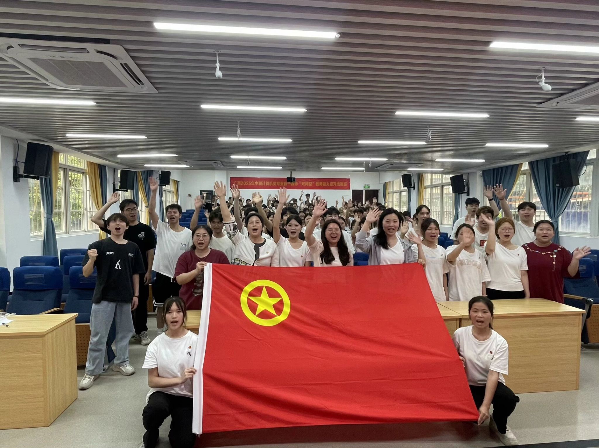 仪式在激昂的国歌声中拉开帷幕,全体人员庄严肃立齐唱国歌。主持人黄月兰宣读新团员名单后,新团员们有序上台,教师与党员代表为其佩戴团员徽章。在领誓人带领下,新团员面向团旗庄严宣誓,铿锵誓言彰显对共青团的忠诚与为共产主义事业奋斗的决心。新团员代表雷钧林表示,入团既是荣誉更是责任,未来将以行动践行誓言。优秀团员代表徐丽琪分享成长经历,鼓励新团员在团组织中成长。