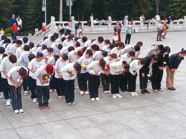 活动中,全体师生怀着无比的敬意,整齐的队伍排成排,手捧着菊花,向长眠于地下的烈士们默哀,师生把手中充满感恩的花献给英勇的烈士,回忆起先人的点点滴滴,学习革命精神,以史为鉴、面向未来。团委书记冯文老师说道,同学们要在中国共产党团结带领中国人民不懈奋斗的光辉历程中汲取民族奋斗意志,用历史的火把照亮中华民族伟大复兴之路,同时要清楚认识国家现在面临的国内外严峻形势,爱国之情不可无。