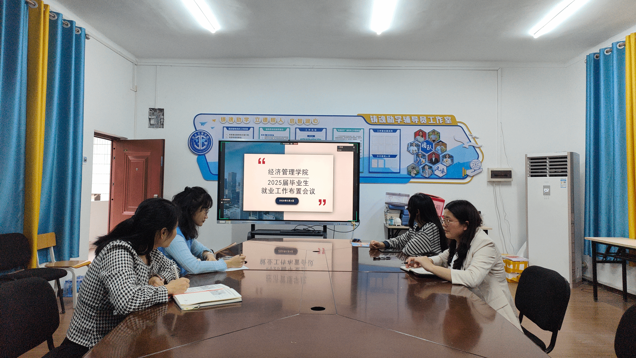 为深入贯彻落实党中央、国务院关于“稳就业”“保就业”决策部署,积极应对复杂严峻的就业形势,全力促进2025届毕业生更加充分更高质量就业,3月4日下午,经济管理学院在会议室召开2025届毕业生就业形势分析会暨就业工作布置会议。学院党总支书记班兰美、就业干事及毕业班辅导员等就业工作相关人员参加会议。