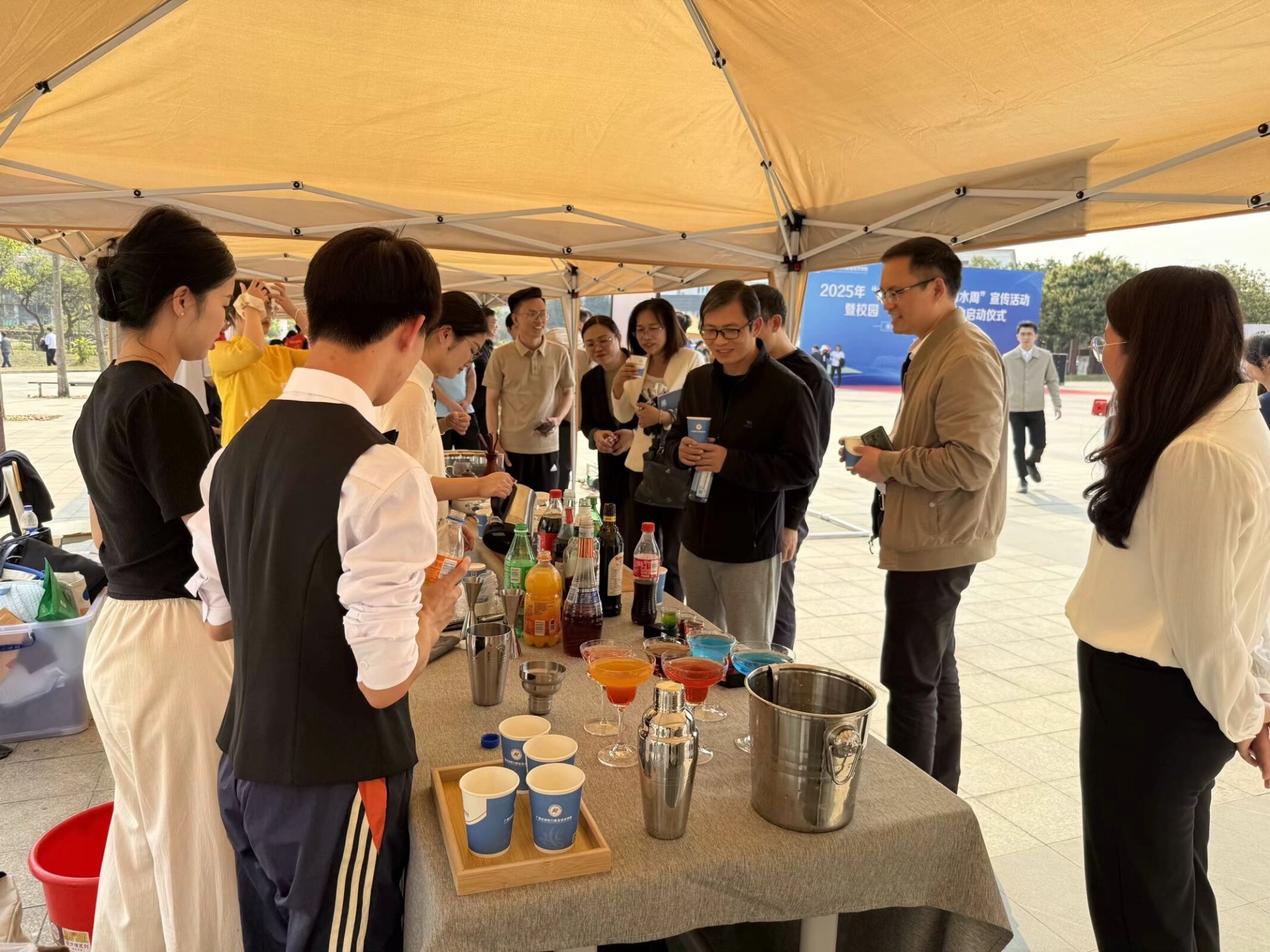 在“水润茶道 经世清源”主题展演区内,茶艺社成员身着传统服饰,在袅袅水雾中演绎行云流水的茶艺之美,吸引往来师生纷纷驻足,或品茗论道,或拍照记录。酒店管理与数字化运营专业展台前,学生们巧妙运用计量冰滴技术,通过精准控制水流速度与温度,将普通汽水、酒水调制为创意十足的“节水特饮”。两个展区成为当日人气最高的文化打卡点。