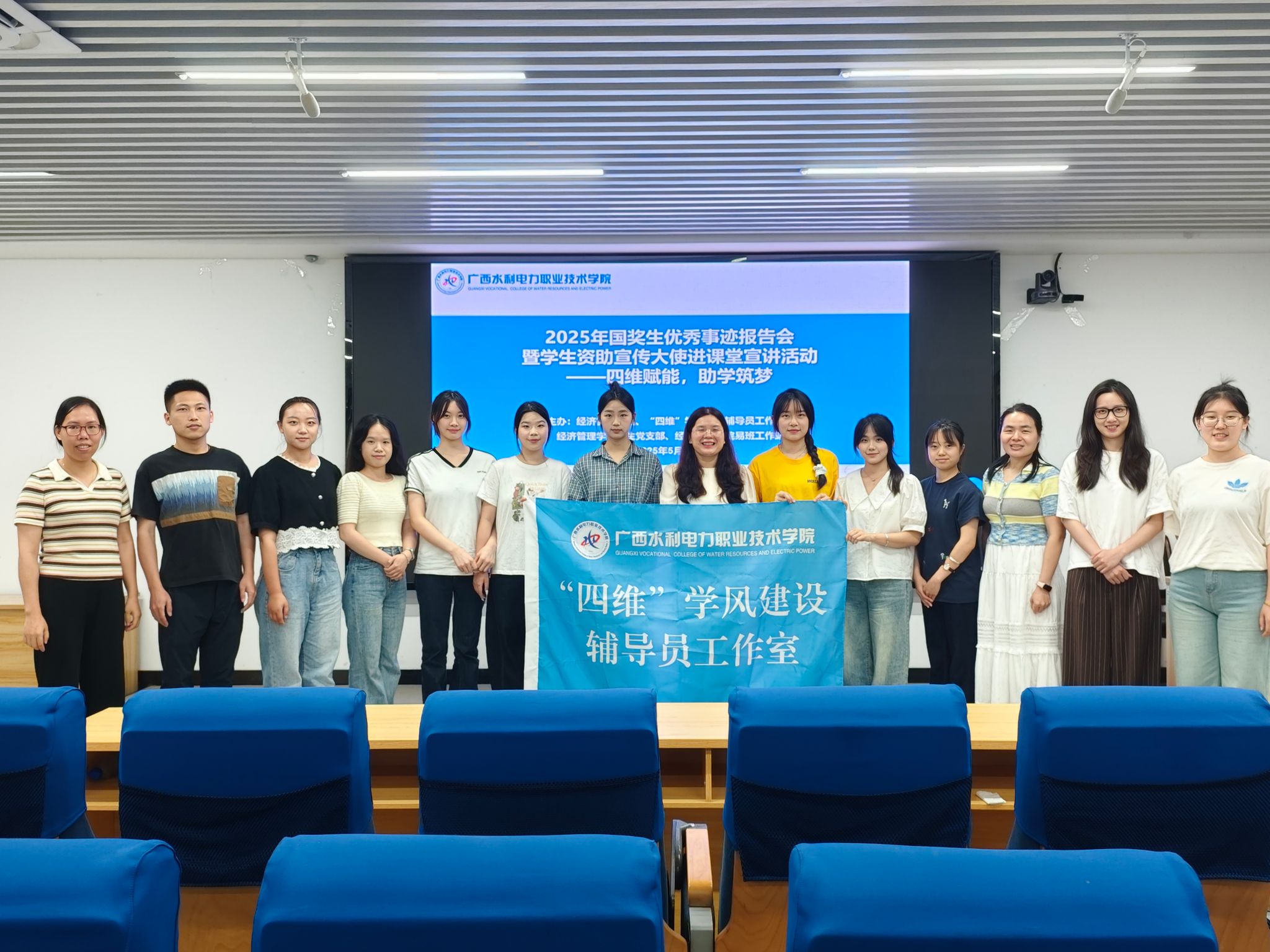 为了进一步加大学生资助政策宣传力度,全面展示资助政策落实成效,切实推动国家学生资助政策家喻户晓、深入人心,5月19日晚,“四维”学风建设辅导员工作室联合经济管理学院学生党支部、易班工作站在长堽校区4教105共同举办了主题为“四维赋能,助学筑梦”的2025年国奖生优秀事迹报告会暨学生资助宣传大使进课堂宣讲活动。活动邀请了学院5位2022级优秀学生代表作为分享嘉宾,吸引了众多学生到场参与,现场气氛热烈,反响积极。