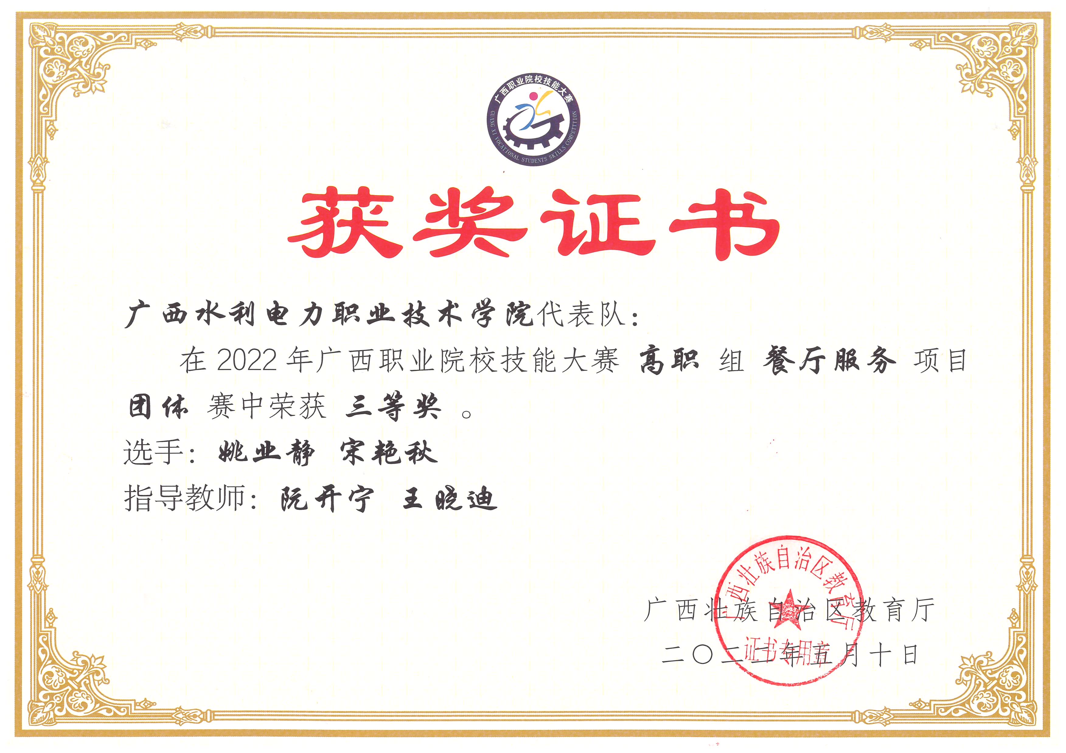 2022 年广西职业院校技能大赛高职组餐厅服务项目团体赛荣获三等奖