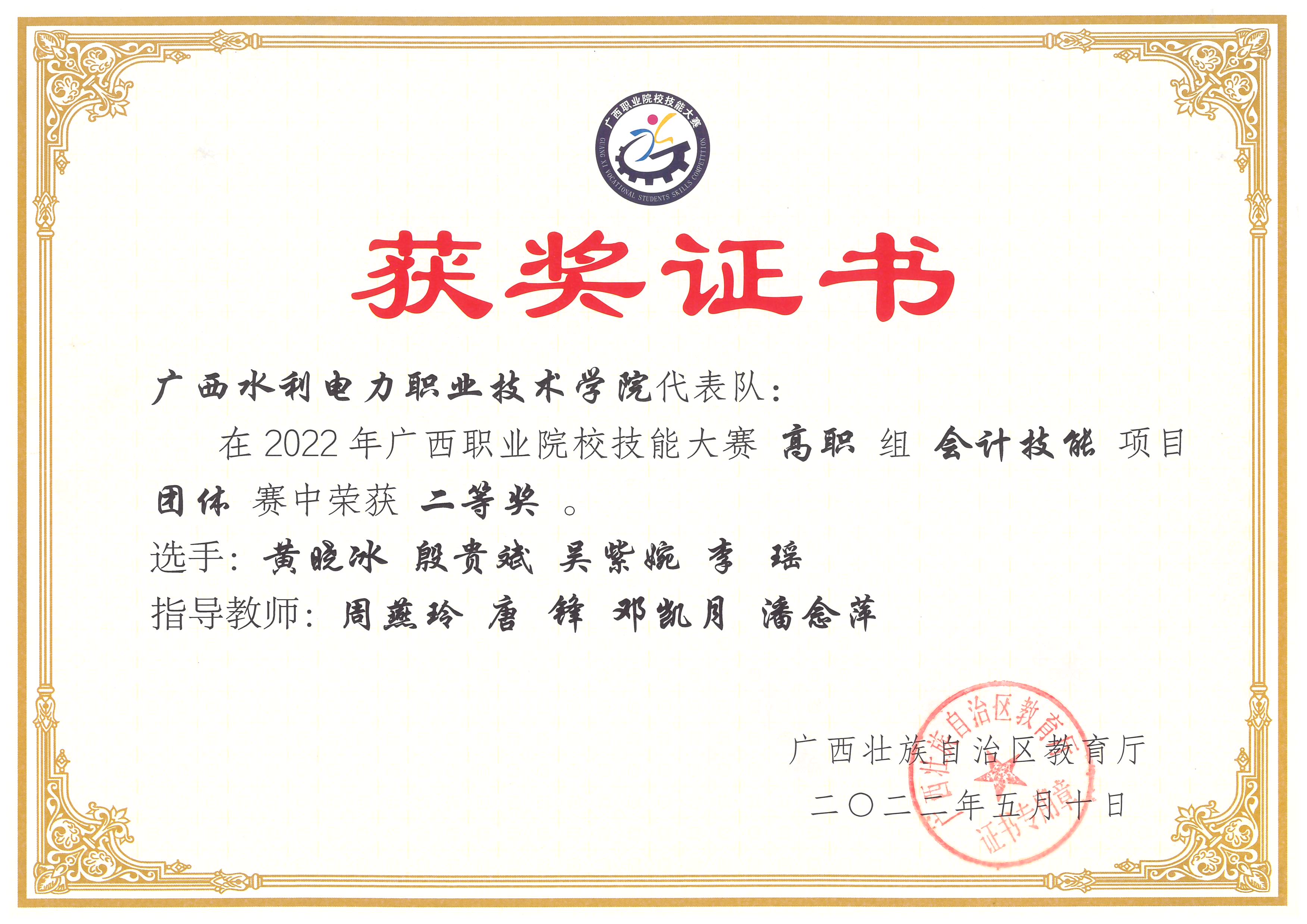 在 2022 年广西职业院校技能大赛高职组会计技能项目团体赛二等奖