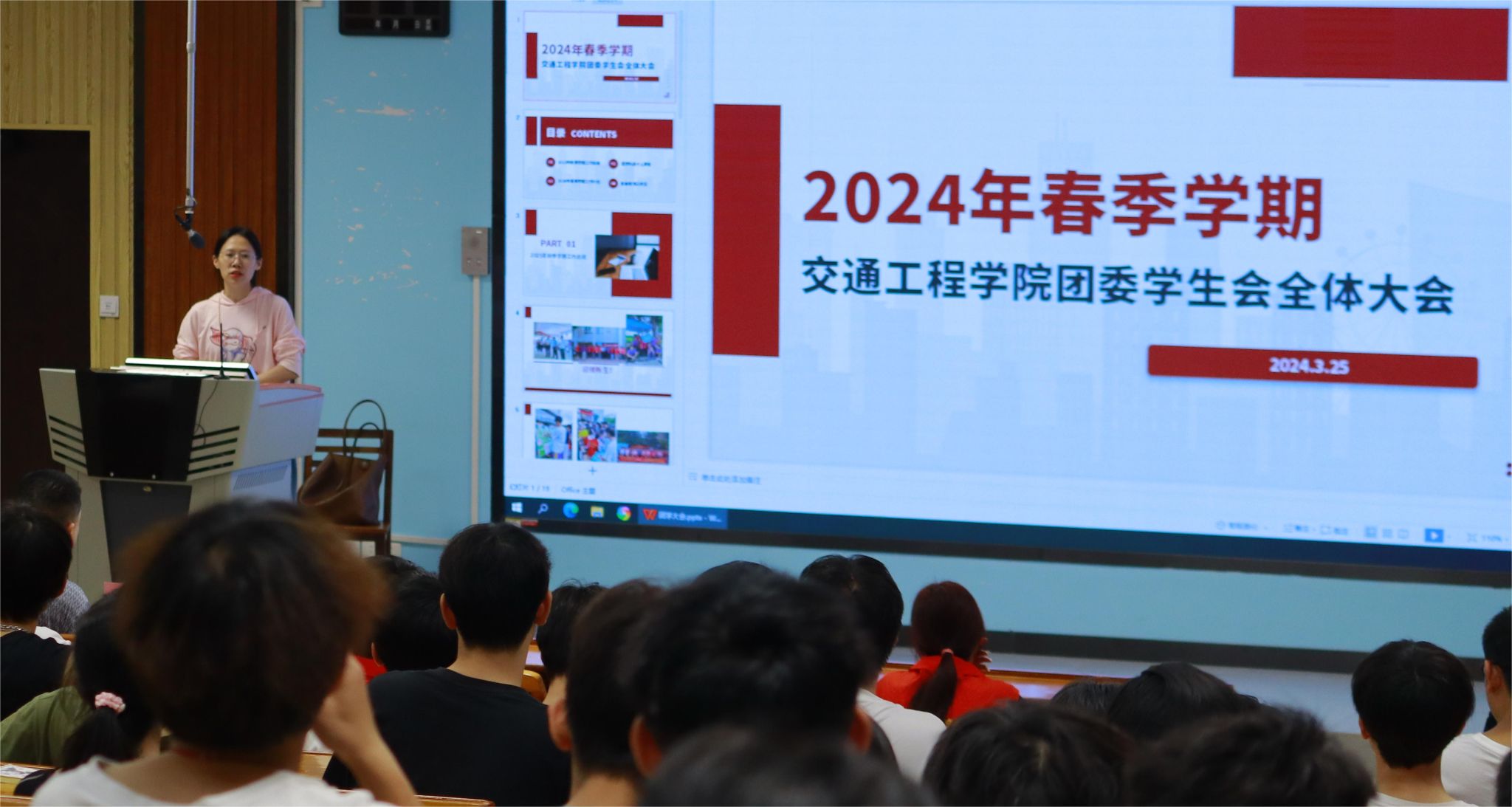 [本网讯]为进一步发挥团学组织凝聚力、战斗力,加强学院团委学生会组织队伍建设,提高团学干部的思想政治素质和工作能力,3月26日晚,交通工程学院在里建校区教学楼阶梯教室401召开2024年春季学期团委学生会全体大会暨培训大会。会议由学院团委副书记梁爱婵老师主持,学院党总支书记张海明老师、组织员兼团委书记黄绿汀老师出席会议,全体团学干部参加会议。