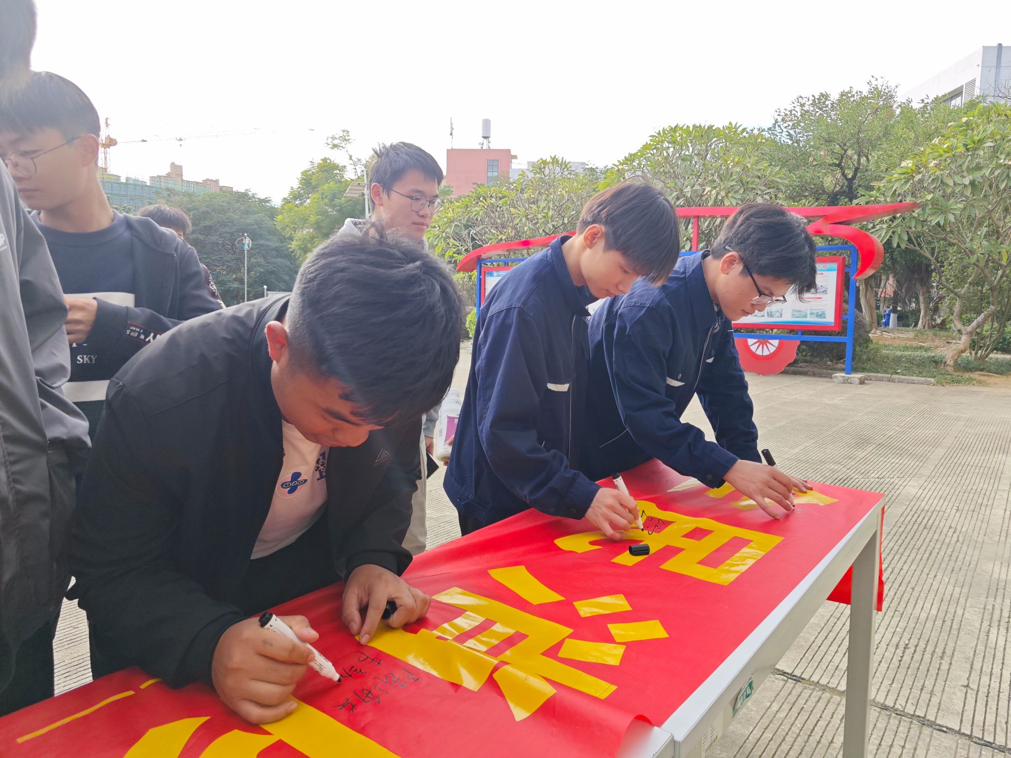 同学们在横幅上签名