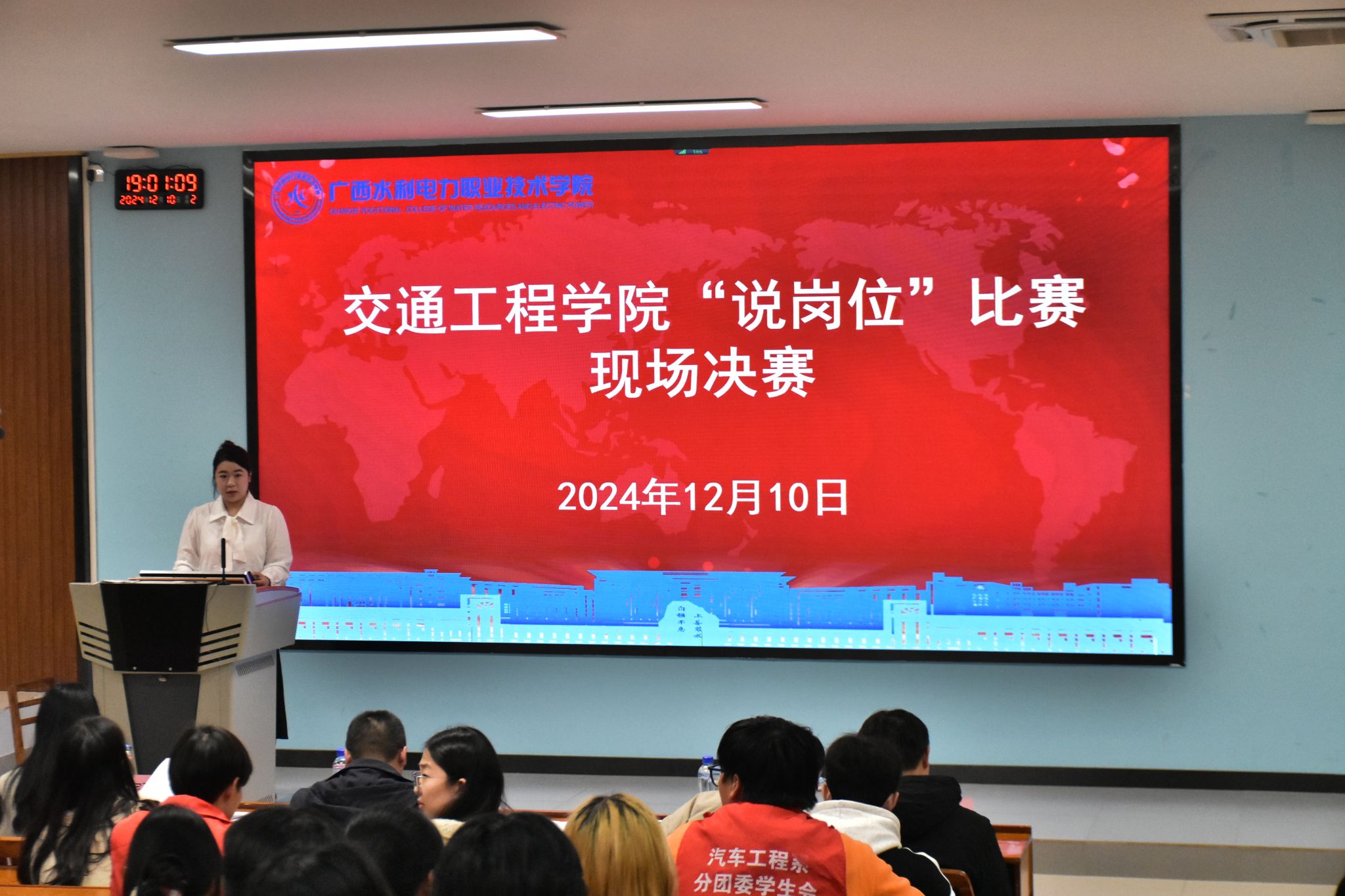 [本网讯]为增强大学生职业生涯规划意识,引导青年学子树立正确的择业观、就业观,助力就业工作提质增效,交通工程学院于2024年12月10日在里建校区教学楼阶梯201教室举办第一届“说岗位”比赛现场决赛。交通工程学院党总支书记张海明、团委书记梁爱婵及教师代表出席本次比赛。
