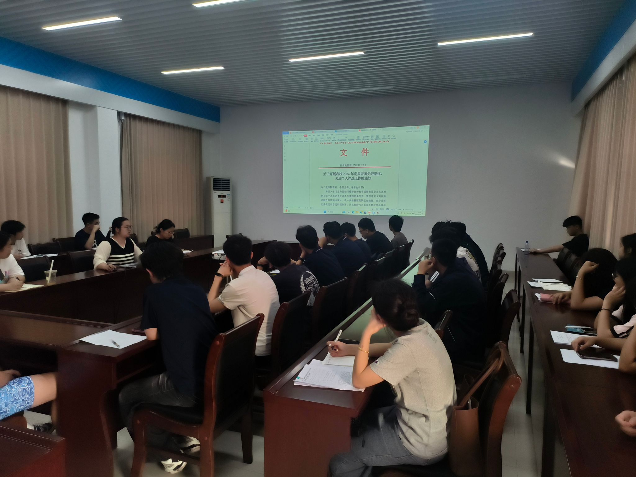 团委副书记姜美婷带领团支书共同学习“五四评优”的文件