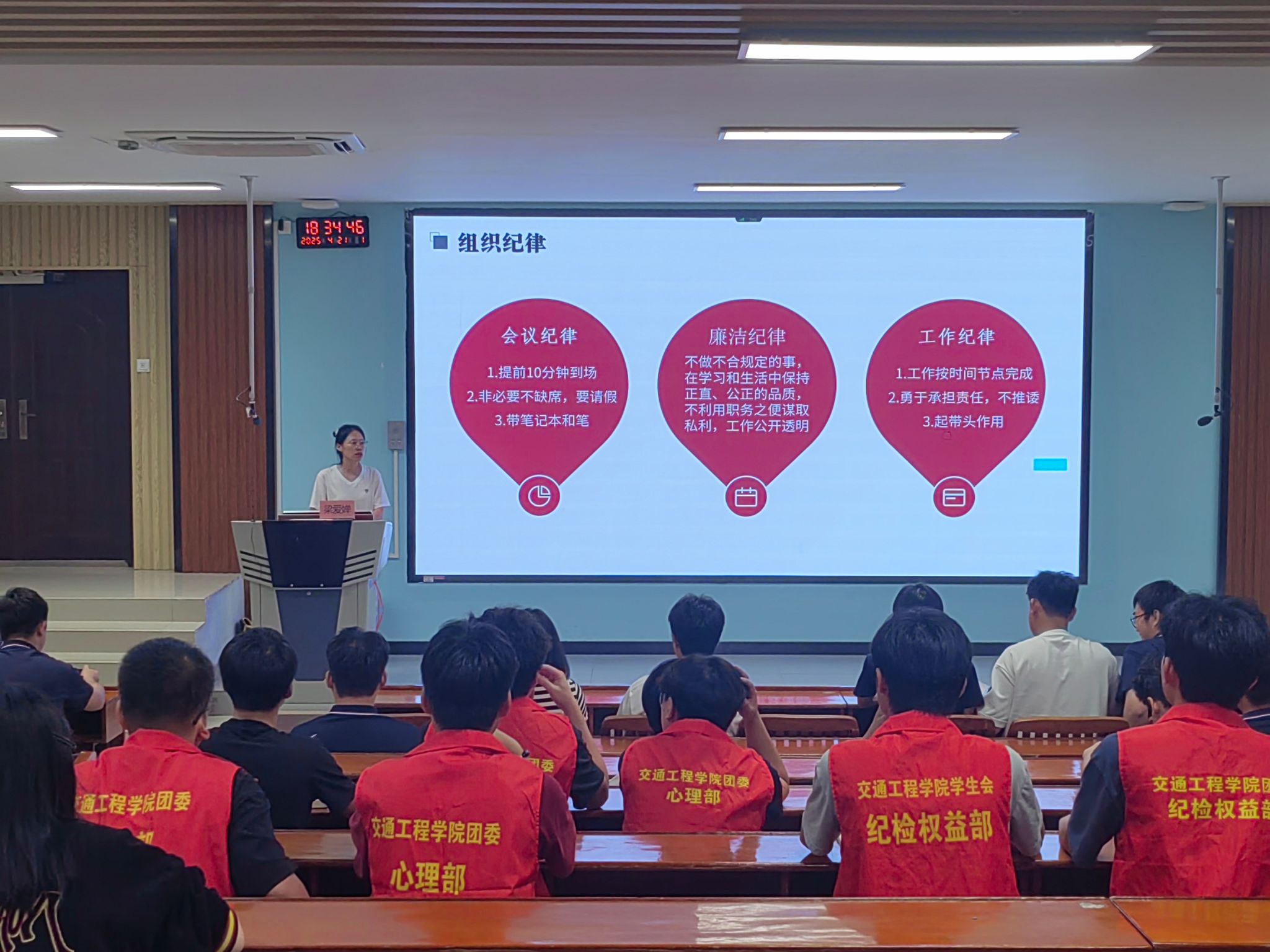[本网讯]为明确学期工作方向,加强交通工程学院团委学生会的组织建设,提升学生干部的综合素质和服务能力,加强学生干部队伍建设,2025年4月21日,交通工程学院团委学生会在里建校区教学楼阶梯教室101召开全体大会暨学生干部素质提升培训班开班仪式。交通工程学院团委书记梁爱婵及团委学生会全体成员出席大会。