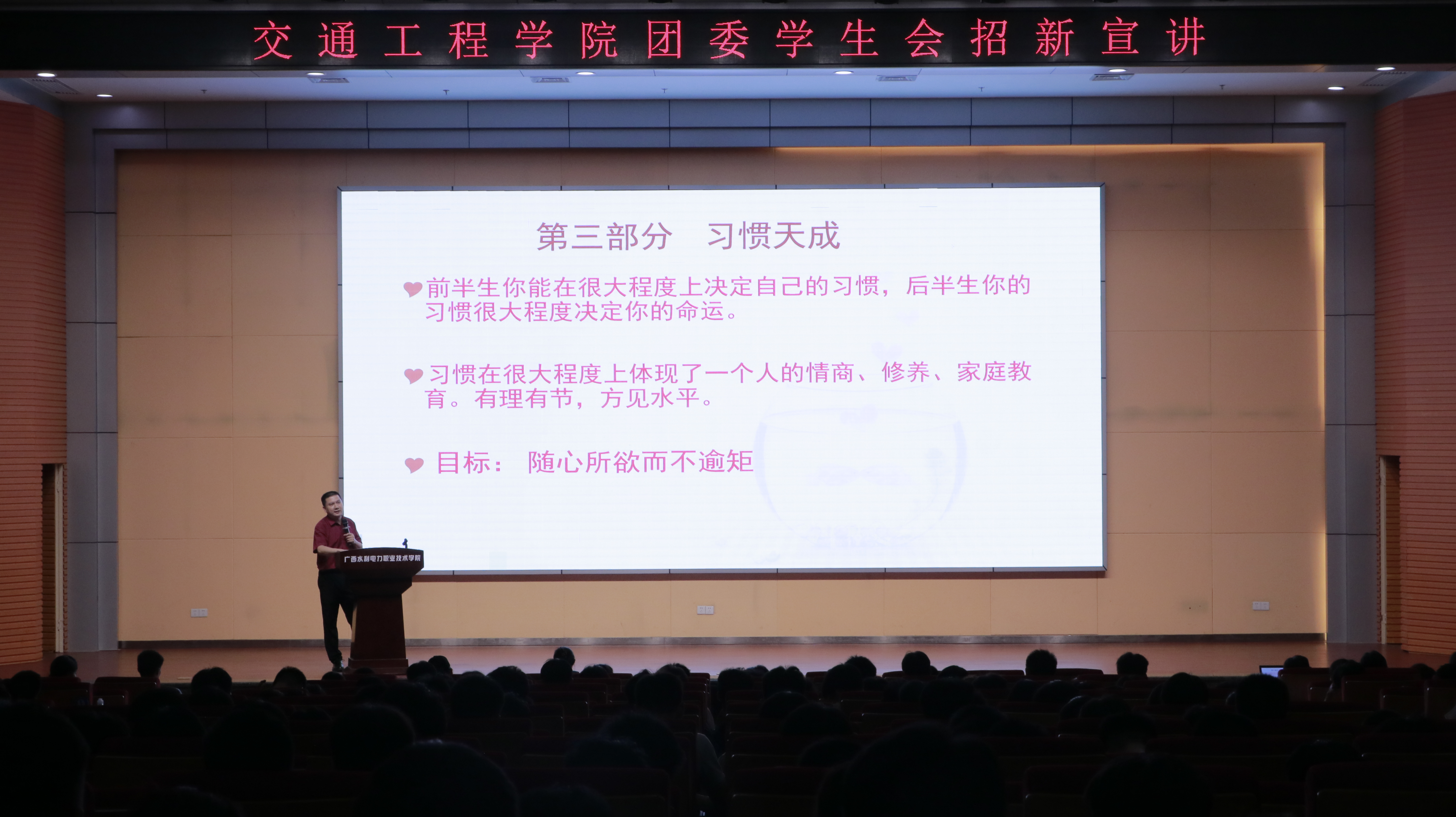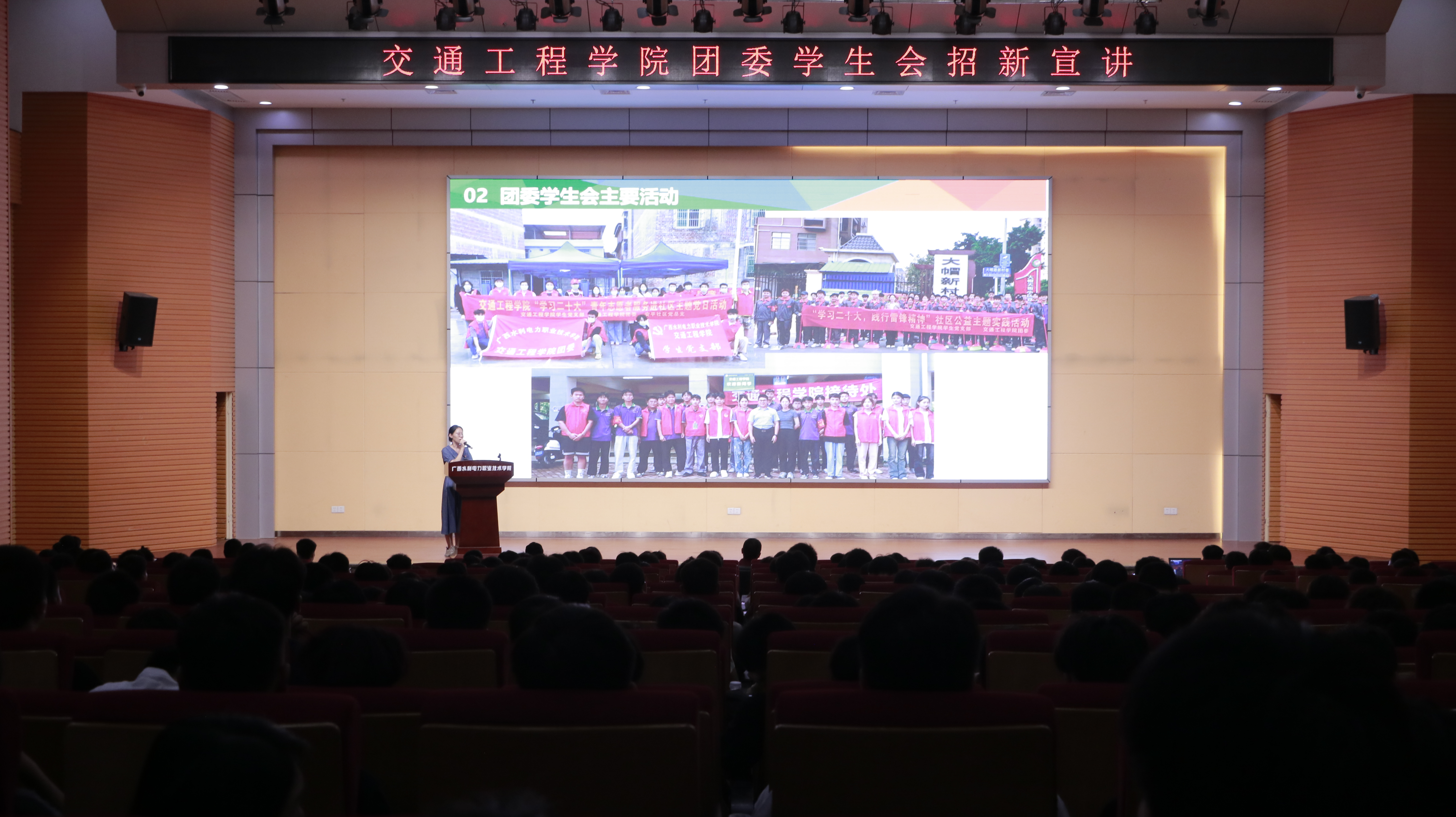 金秋九月,开门纳新。为给2023级新生提供一个锻炼自我,展示自我,提升自我的平台,同时为学院团委、学生会学生干部队伍充实新鲜血液,确保学生工作可持续发展,帮助新生全方位了解学院团委学生会,鼓励同学们锐意进取、锻炼自我,向充实、多彩的大学生活目标迈进,9月19日,交通工程学院团委学生会在里建校区青年之家学术报告厅组织召开2023年招新宣讲会,交通工程学院团委书记黄绿汀老师、团委副书记梁爱婵老师及交通工程学院团委学生会全体成员与会,交通工程学院2023级全体新生参加会议。