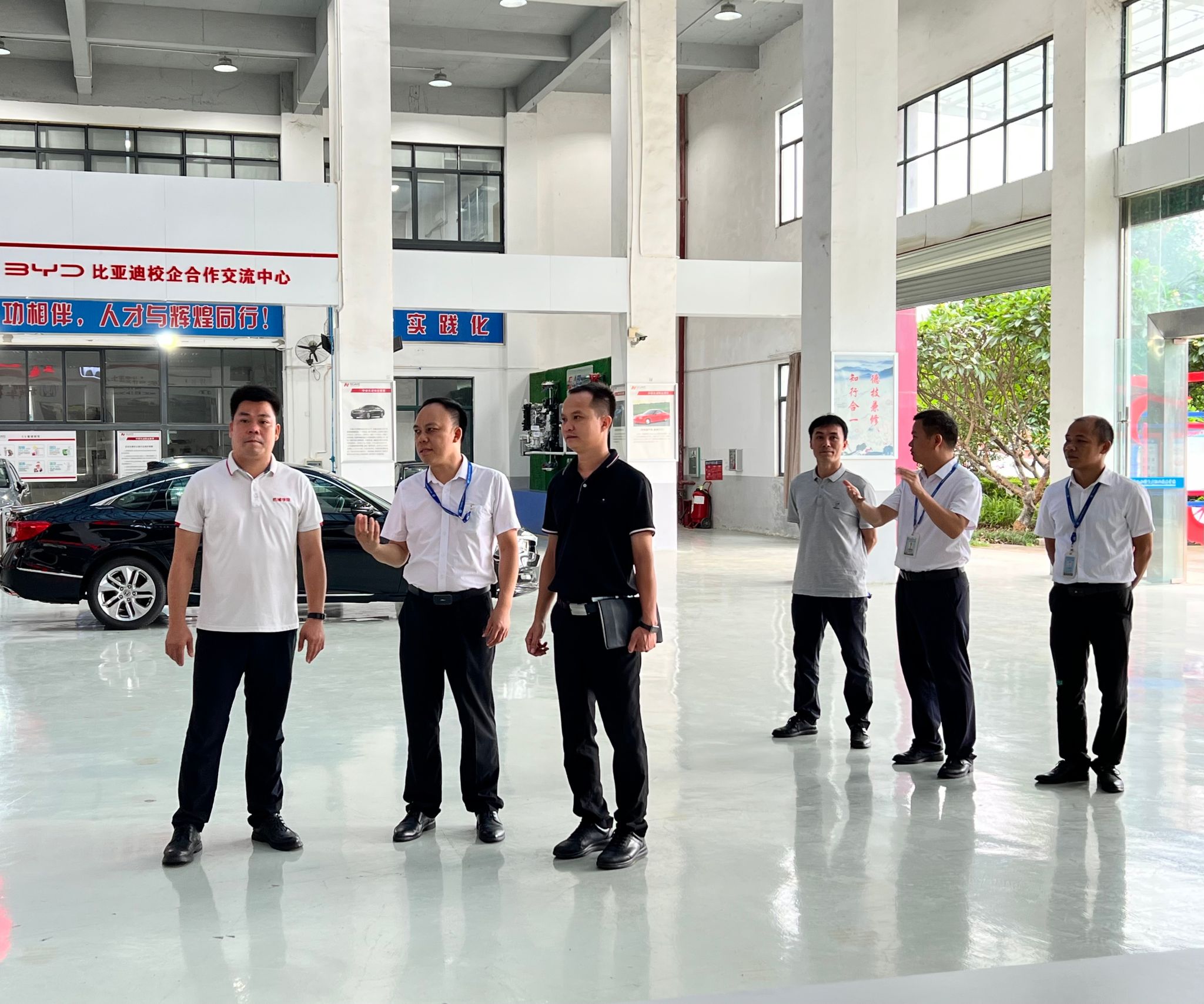 覃薛宇一行首先参观了学院汽车实训中心。随后,双方聚焦实训中心建设与规划、汽车专业未来发展趋势等多个关键领域,展开了深入探讨,并进行了经验分享。