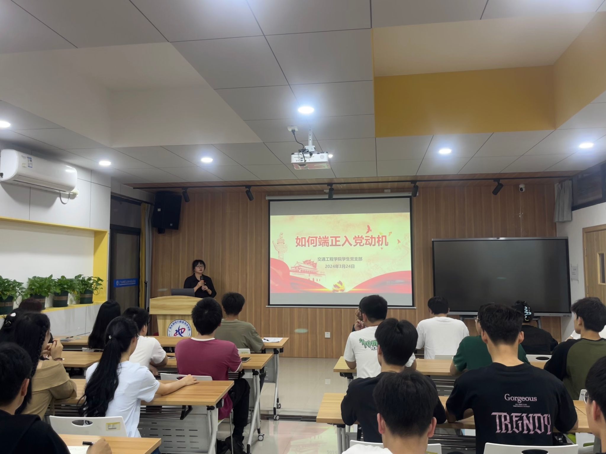 [本网讯]为深入贯彻落实党的二十大精神,提高入党积极分子的思想觉悟,引导入党积极分子端正入党动机、坚定理想信念,交通工程学院学生党支部于2024年3月24日在里建校区和园社区多功能厅开展了以《如何端正入党动机》为主题的党课,对2022级入党积极分子进行培训,由学生党支部书记梁展榕主讲。