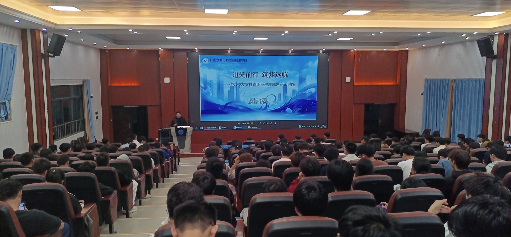 为助力新生迅速适应新角色、合理规划职业发展路径,11月6日晚,交通工程学院在里建教学楼201报告厅隆重举行了以“追光前行,筑梦远航”为主题的职业生涯规划讲座。本次讲座特邀2018级汽车检测与维修技术专业优秀毕业生、现任职于广西道之星奔驰豪华商务车销售有限公司售后部机修组长文桂青担任主讲嘉宾。学院副院长贺敏超、2025级辅导员代表以及2025级新生代表共同参与了本次讲座活动。