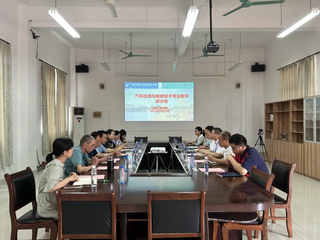 [本网讯]在学习贯彻习近平新时代中国特色社会主义思想主题教育总体部署下,为了深入贯彻落实教育厅关于pp电子与广西经济职业学院结对帮扶工作的总体要求,2023年5月25日,广西经济职业学院教务处处长李敬生一行7人到pp电子交通工程学院开展汽车检测与维修技术专业教学研讨会,交通工程学院院长梁小流、院长助理陈小长、实训中心主任梁耀杰、交通工程学院3个教学团队负责人参加研讨会。