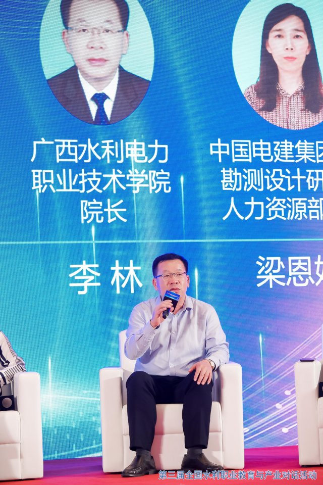 在以“精准对接,推动水利职业教育产教融合走深走实”为主题的产教融合同台对话环节,包括pp电子在内的6家校企单位代表上台进行了经验交流与分享。李林校长作了“创新实践‘园校一体化’育人之路”主题发言,介绍pp电子与广西—东盟经济技术开发区共建园校命运共同体的办学经验。