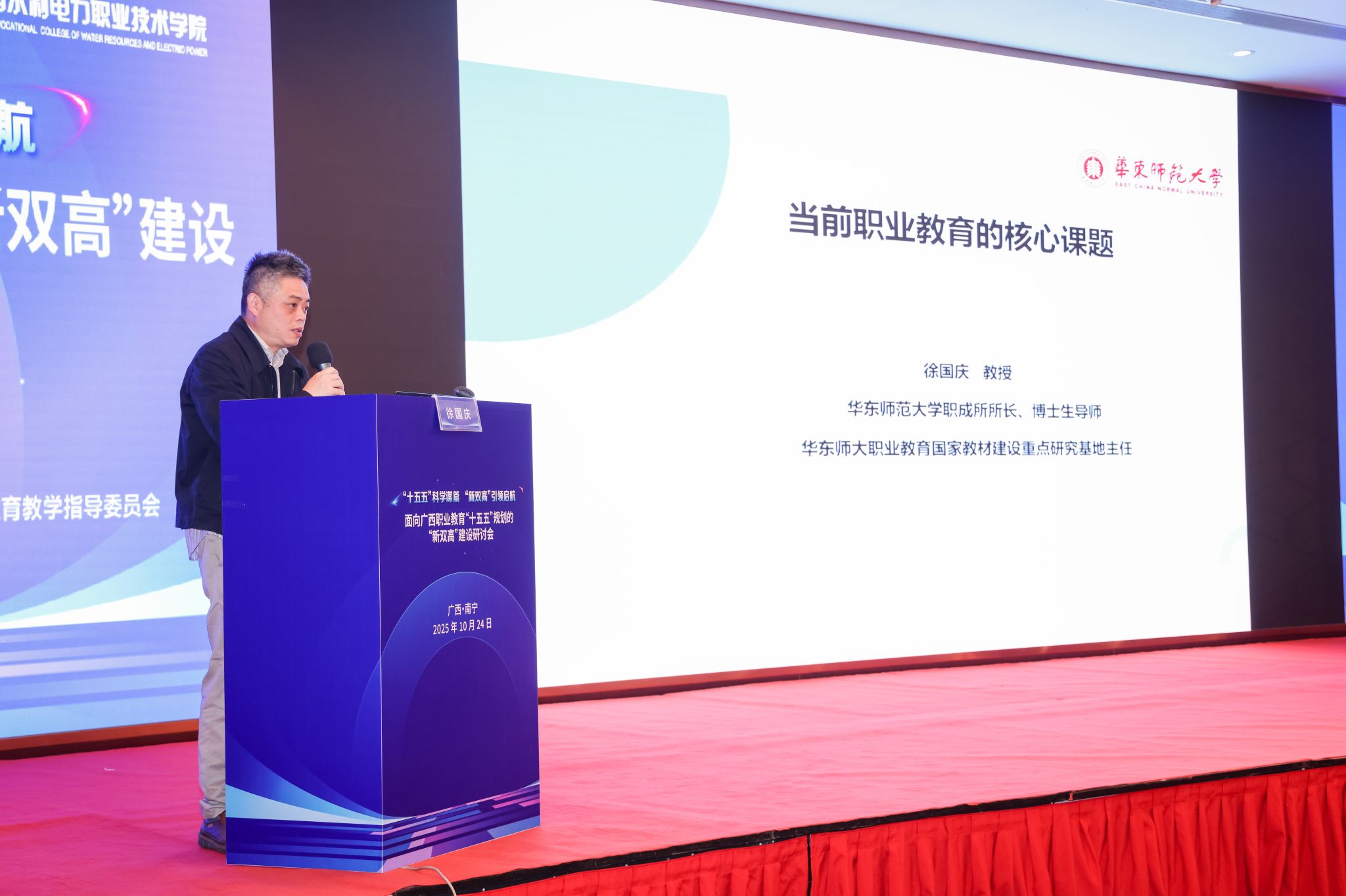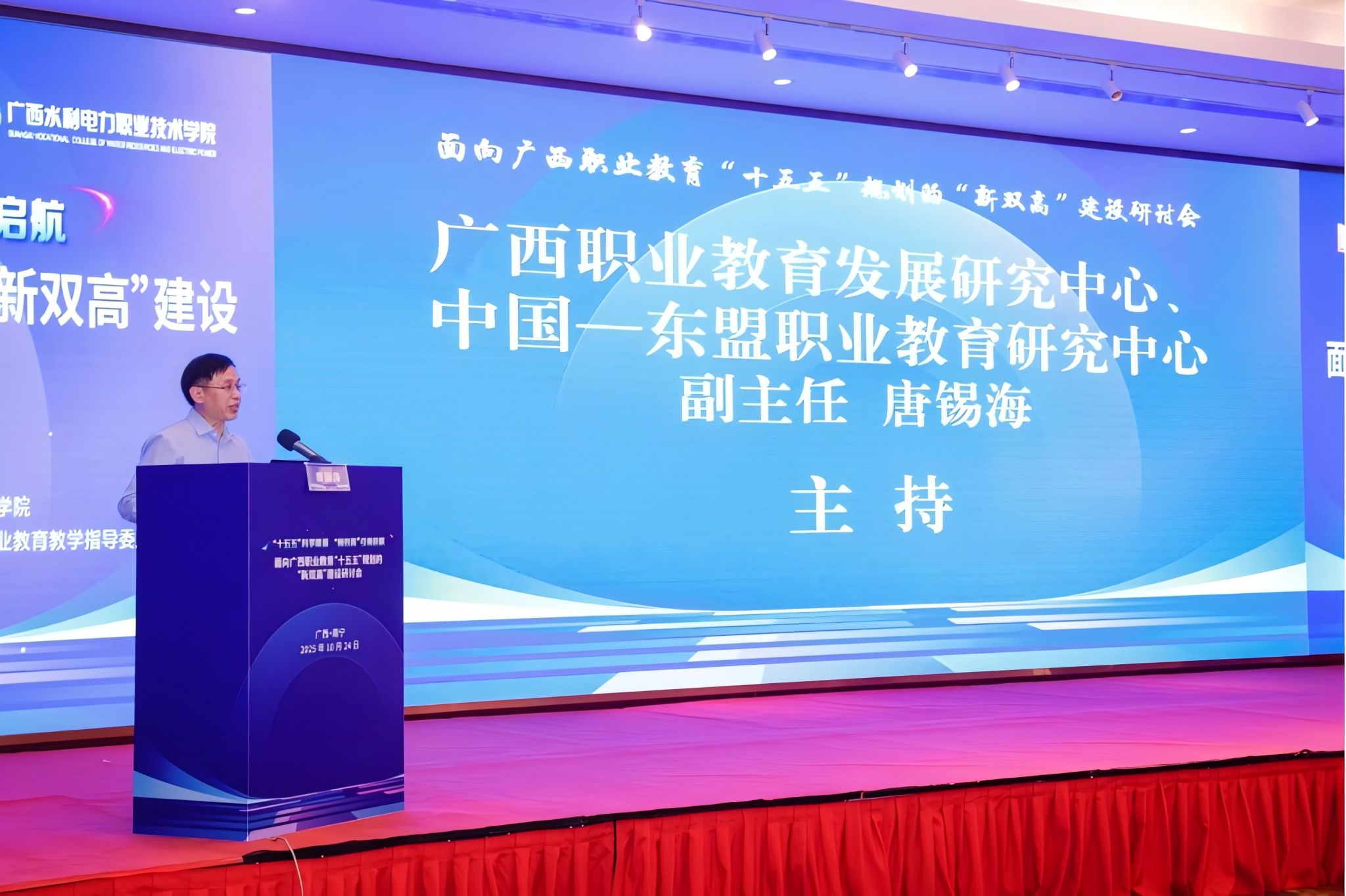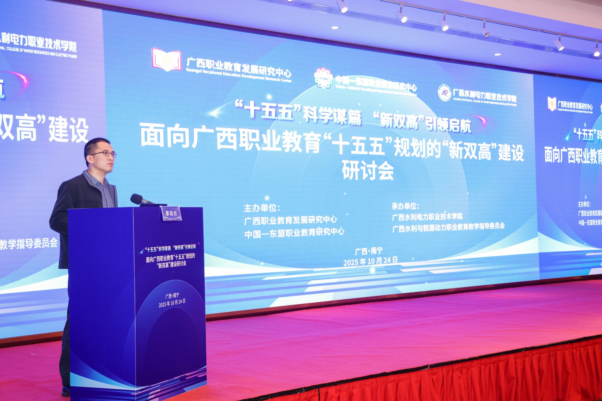 [本网讯]10月24日,由广西职业教育发展研究中心、中国—东盟职业教育研究中心(以下简称“双中心”)主办,pp电子和广西水利与能源动力职业教育教学指导委员会承办的“面向广西职业教育‘十五五’规划的‘新双高’建设研讨会”在南宁顺利召开。华东师范大学徐国庆教授,广西壮族自治区教育厅职成处副处长廖造壮,南宁师范大学副校长、“双中心”主任王国红,“双中心”常务副主任王屹,pp电子党委副书记、校长刘存香等专家和领导出席研讨会。会议开幕式由pp电子副校长周涛主持。