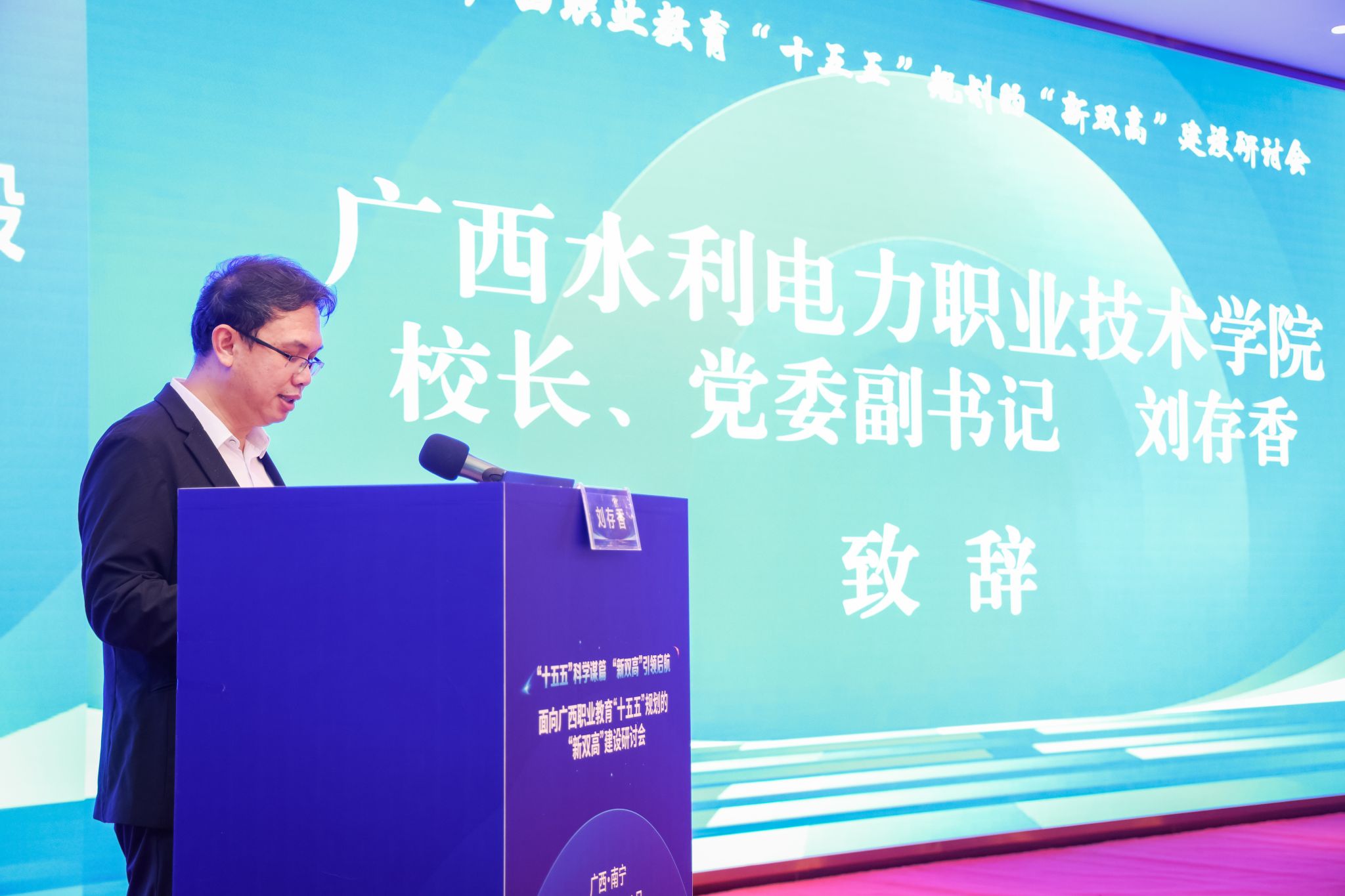 刘存香代表承办单位向与会代表致以诚挚的问候,并对长期以来关心支持学校建设发展的各级领导及兄弟院校的同仁们表示衷心的感谢。他表示学校一直以来坚持服务国家战略、服务区域发展、服务学生成才,将专业(群)建设作为立校之本,目前已形成广西高水平专业为龙头、多领域特色专业协同并进、联动发展的专业集群新格局,为推动区域与行业高质量发展贡献了“水电智慧”与“水电力量”。