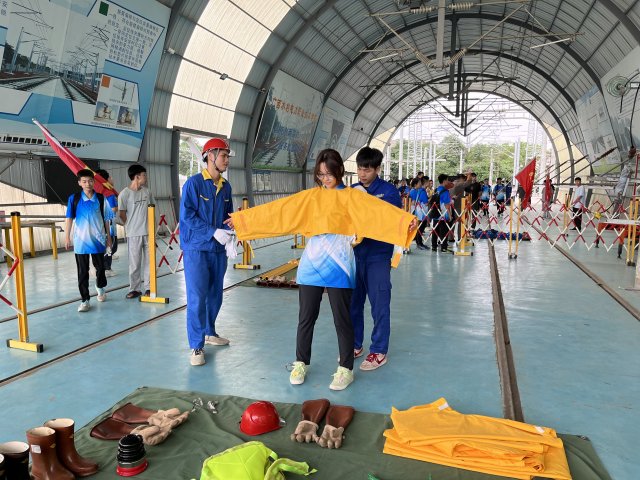 研学活动分两个小组交叉同时进行,同学们在科普活动志愿者的带领下,前往各个专业学院,沉浸式体验安全防护、工程测量、节水灌溉不停电作业、健身发电自行车、VR沉浸式工业机器人机械结构组成、创新方法“TRIZ”科普、无人驾驶汽车自动行驶、传统木构建筑制作、装配式建筑、砌筑及钢筋绑扎技能、城市轨道交通运行、城市轨道交通列车驾驶、自动化生产线安装与调试等13个别具特色的职业项目。同学们都被这些精彩纷呈的职业技能所吸引,意犹未尽,流连忘返。