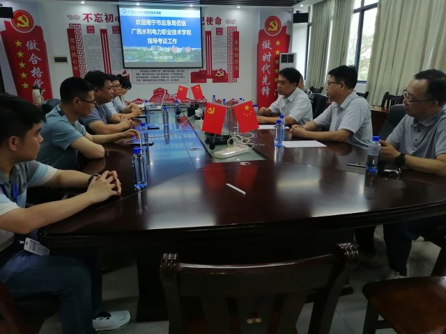 [本网讯]5月31日下午,南宁市应急局安全生产宣传教育中心主任林宇一行到pp电子里建校区开展特种作业考证考察指导工作,广西机电职业技术学院罗邕生、周正杰,广西工业职业技术学院张忠坚等考评专家陪同。pp电子继续教育学院院长谭社平、电力工程学院院长左江林、自动化工程学院院长陈光会、电力工程学院副院长谭振宇陪同考察。