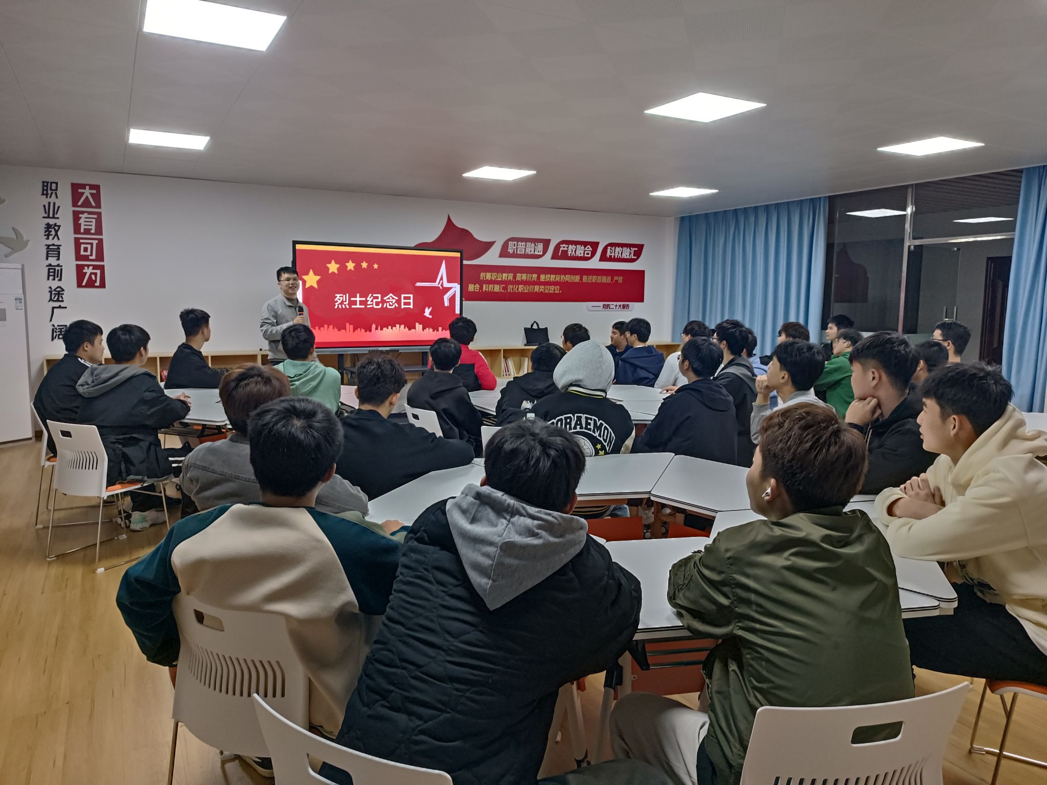 [本网讯]为贯彻落实党的二十大精神,弘扬英烈精神、涵养爱国情怀,培育和践行社会主义核心价值观,12月28日下午,马克思主义学院在里建校区“思政沙龙”活动室开展“学英烈保护法,弘扬英烈精神”法治宣传月主题活动。马克思主义学院教师陆雄杰、黄小莉及2023级机械制造3班的44名学生参加了活动。