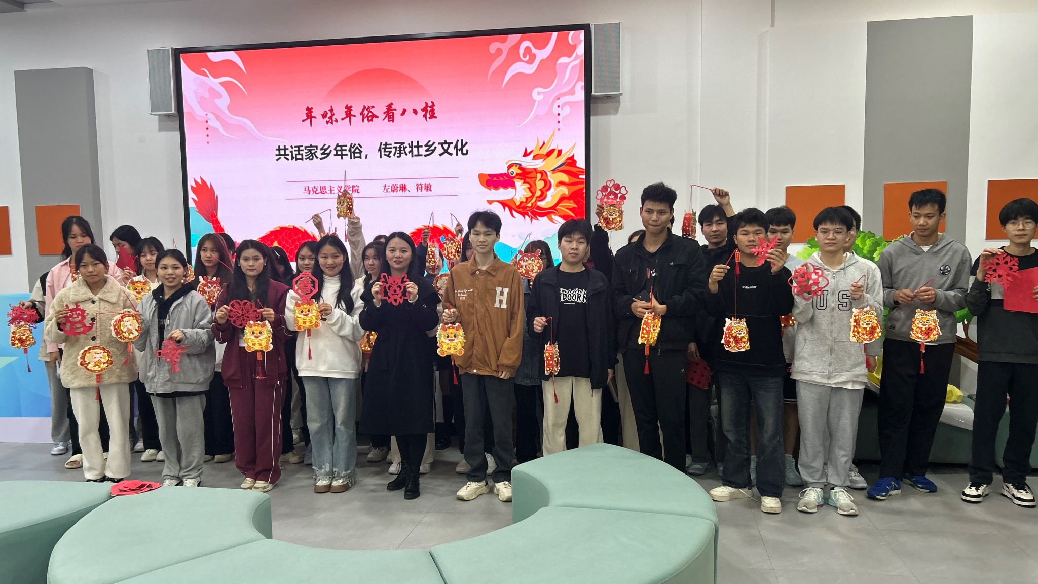 [本网讯]为深入学习贯彻习近平文化思想,推动中华优秀传统文化创造性转化和创新性发展,深挖民族节日文化的丰富内涵,坚定文化自信,3月13日,马克思主义学院教师左蔚琳、符敏在长堽校区“一站式”学生社区组织开展传承中华民族优秀传统文化主题活动之“年味年俗看八桂——共话家乡年俗 传承壮乡文化”。来自经济管理学院、信息工程学院的40名同学参加了本次活动。