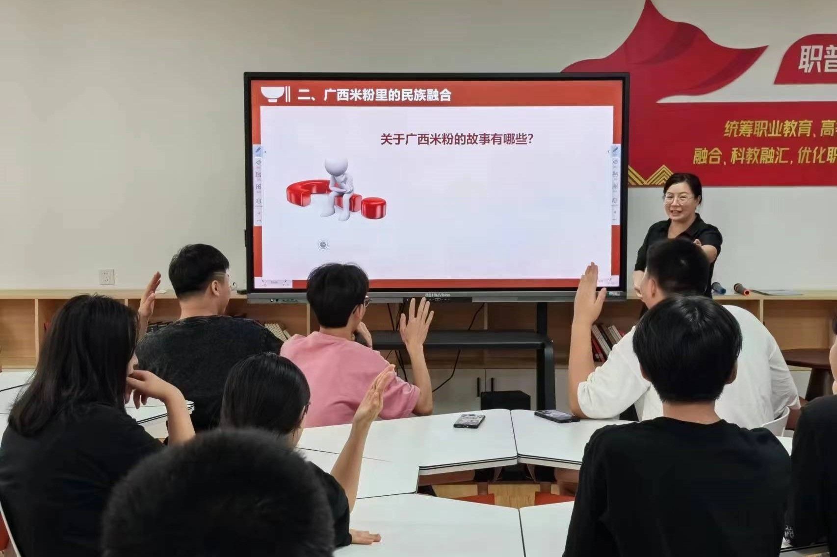本次活动围绕“米粉里的历史文化——米粉里的民族融合——米粉里的共同富裕”这一主线展开。首先,通过参观广西首个米粉博物馆(网上展厅),从米粉的由来、制作过程到历史演化三个方面讲述米粉2000多年的历史文化,引导学生理解中华民族美食代表各民族的风土人情、生活习惯,承载着民族的共同历史记忆,是各民族共享的文化符号之一。其次,带领学生讲述“瑶人献药”“阿牛嫂米粉”“老友探病”三个故事,从故事中了解米粉是在南北方各民族长期不断交往交流交融中形成的,领会中华各民族在融合过程中同甘共苦、相互支持的朴素情感。最后,通过品尝米粉味道,探寻“小米粉”成为“大产业”的奥秘,讨论如何进行米粉创新发展,推动产业发展和实现各民族共同富裕,引导学生牢固树立“四个与共”理念,在共同富裕的道路上披荆斩棘,在负笈前行的道路上淬炼成才。