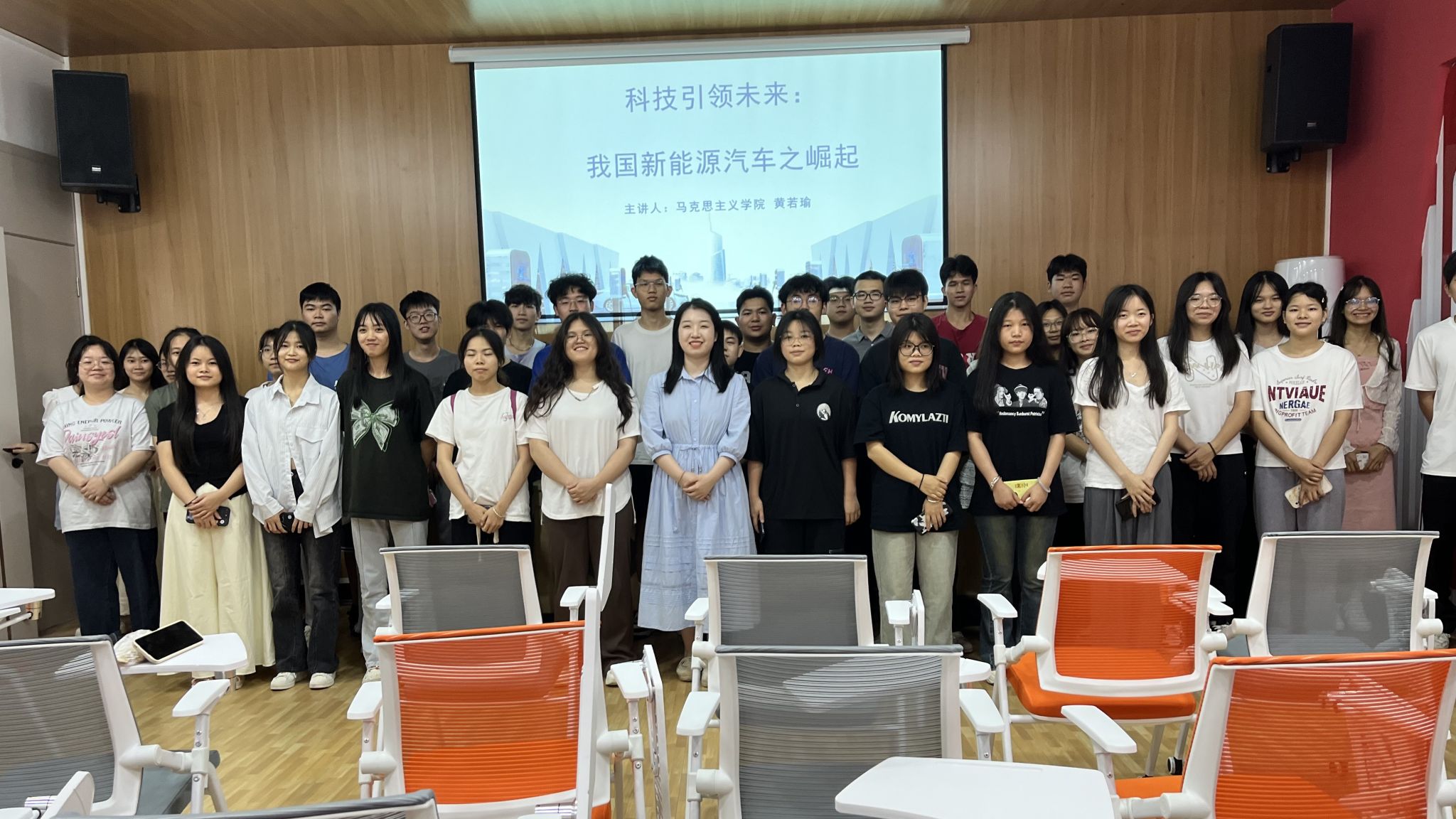 [本网讯]为进一步引导大学生树牢科技报国之志,刻苦学习钻研,勇攀科学高峰,在推进强国建设、民族复兴伟业中绽放青春光彩,5月10日下午,马克思主义学院教师黄若瑜在长堽校区“一站式”学生社区党团活动室组织开展“科技引领未来 我国新能源汽车之崛起”思政沙龙活动,信息工程学院23级共35名同学参加活动。