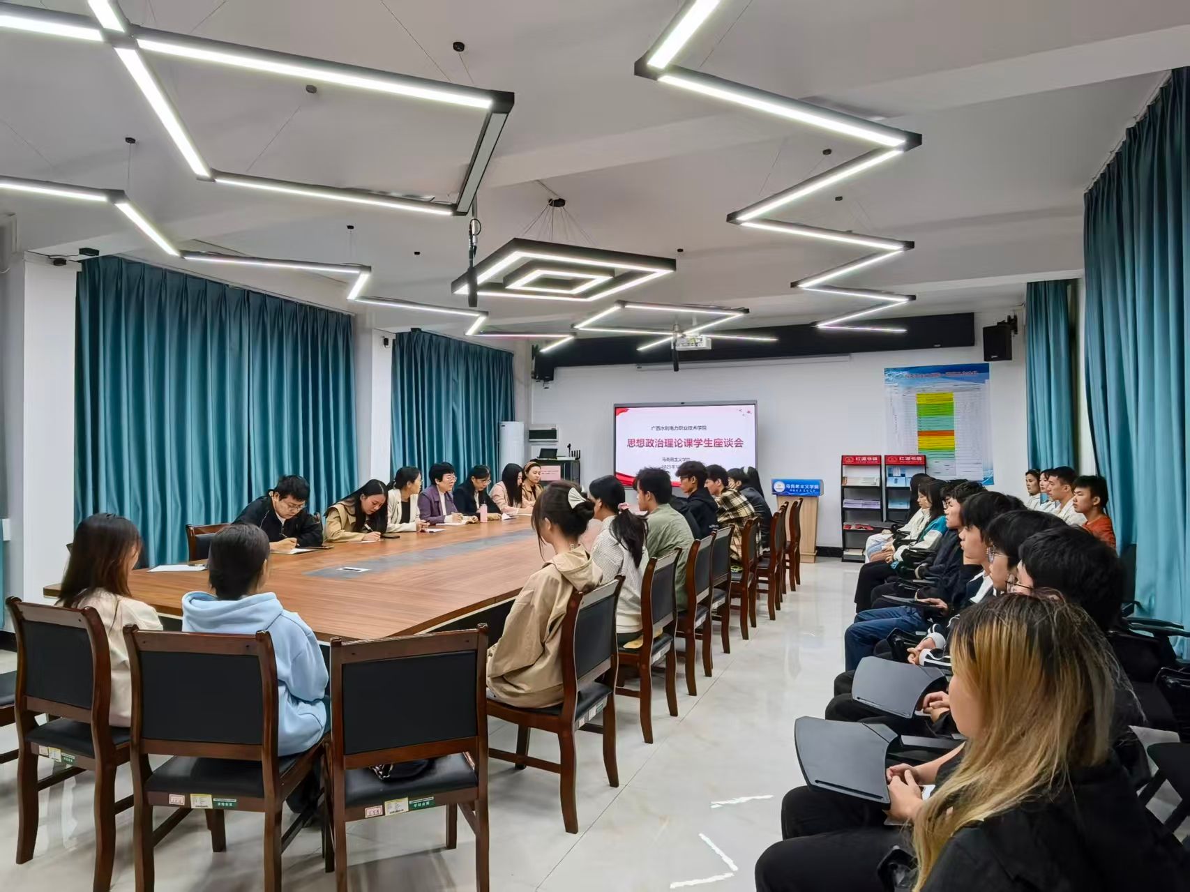 马院院长助理董自稳、院级教学督导组成员、教师代表以及2024级、2025级各班学生代表参加了本次座谈会。(蓝燕燕/文,蓝燕燕、唐烨余/图)