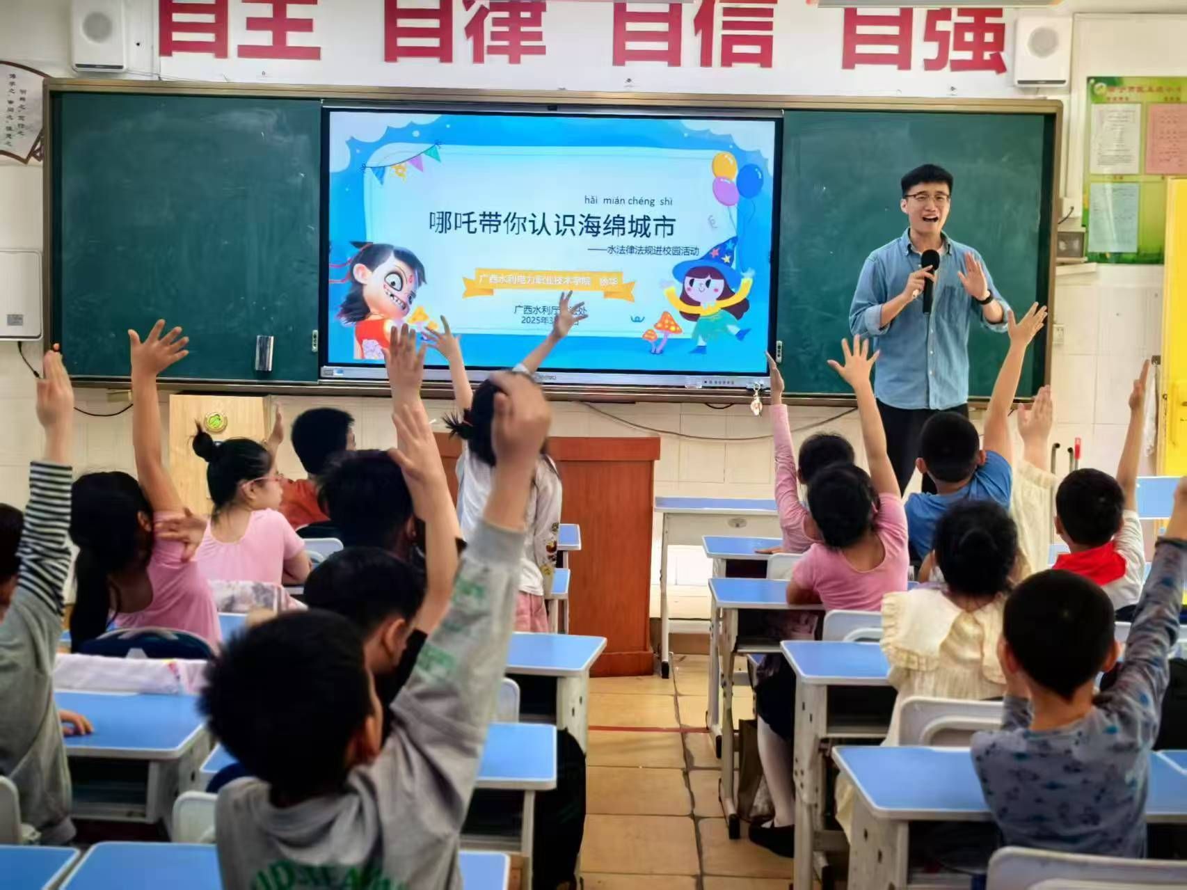 杨华老师以《哪吒带你认识海绵城市》为题,从海绵城市初探、海绵城市的六大“法宝”、践行“美丽中国·壮美广西”三个方面进行了深入浅出的阐述,以亲切鲜活的案例、通俗易懂的语言、别出心裁的互动,很快抓住了小朋友们的兴趣点,让学生快速了解水法律法规,明白一些水资源保护和利用的相关规定,引导同学们从自身做起,从小事做起,如随手关好水龙头、合理利用水资源等,形成良好的节水意识和行为规范,整个过程高潮迭起,宣讲活动收到了良好的效果。