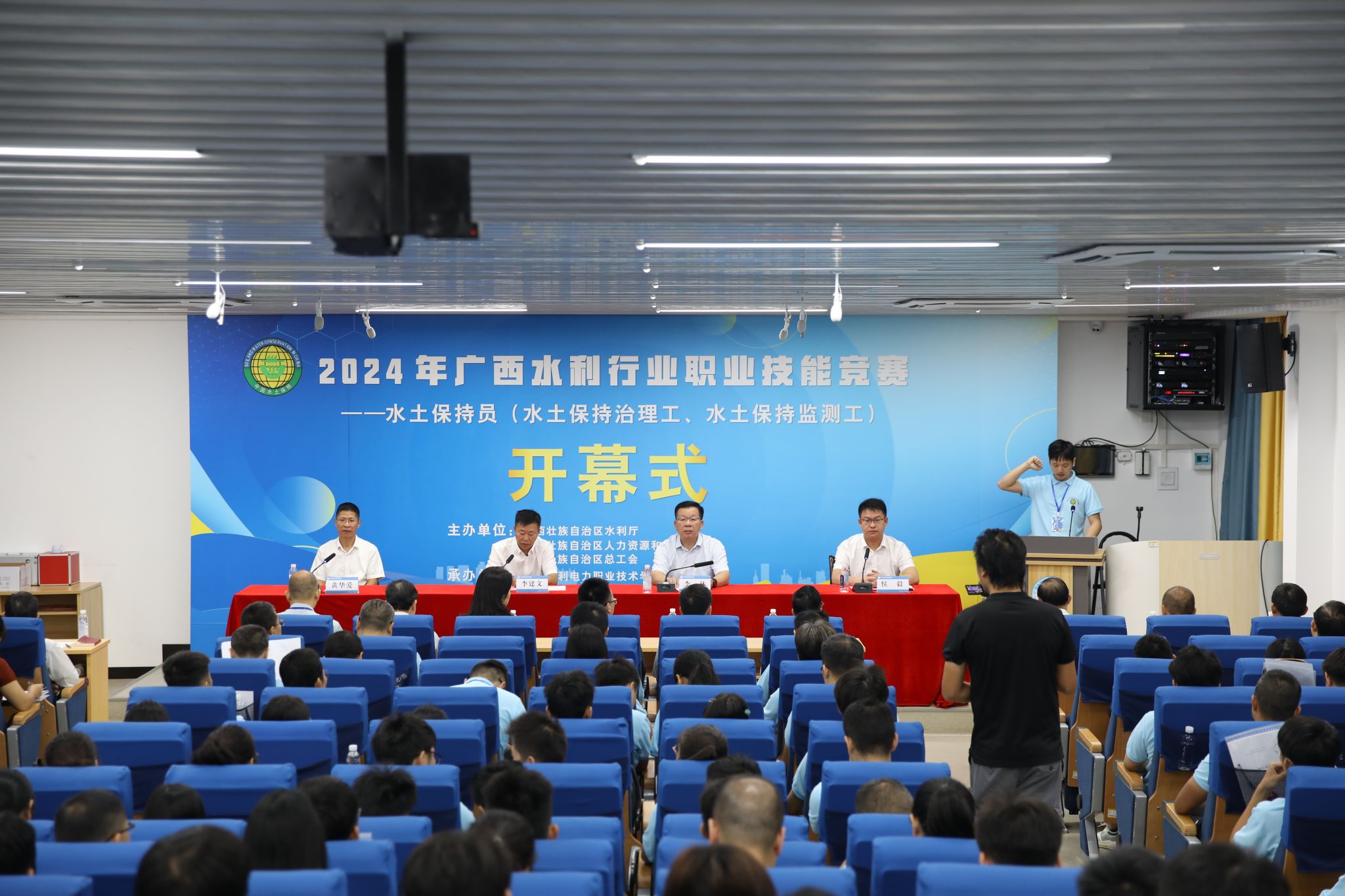 广西壮族自治区水利厅副厅长、一级巡视员、竞赛组委会主任李建文,学校校长李林,自治区总工会劳动和经济工作部副部长侯毅出席开幕式并致辞。学校副校长周涛、自治区水利厅机关党委(机关纪委)副书记闫雅琼、自治区水利厅人事处副处长宾能勇、广西水土保持监测站站长宁春鹏、广西壮族自治区水利科学研究院副院长吴卫熊、广西水土保持学会副理事长、秘书长黄旭升、广西水利电力勘测设计研究院有限责任公司副总经理林栋材出席开幕式。仪式由自治区水利厅水土保持处处长黄华爱主持。