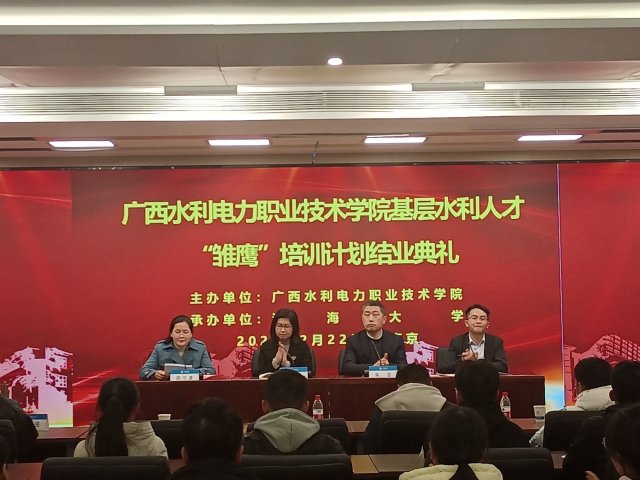 [本网讯]2月22日下午,广西首批订单式培养的基层水利人才“水利综合能力素质提升班”结业典礼在河海大学举行。党委组织部(人事处处长区倩如、河海大学继续教育学院院长朱亚学校水利工程学院党总支书记班兰美84名基层水利人才订单班学生到场参加本次活动水利工程学院水利水电工程管理团队负责人韦庆华主持