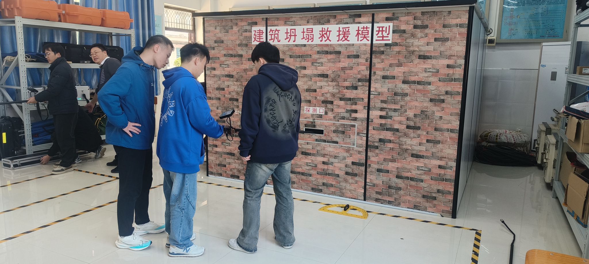 参观交流环节,黄炯森详细讲解了生产安全事故发生时,从闻警后的救援准备到现场的生命探测与人员救护等过程的应对措施,并进行了实操演示。在黄炯森的指导下,pp电子师生亲身体验了隔绝式正压氧气呼吸器等救援设备的穿戴、气体取样做爆炸风险评估、建筑坍塌救援探测、搬运和救治伤员、心肺复苏等一系列救援救护实操演练