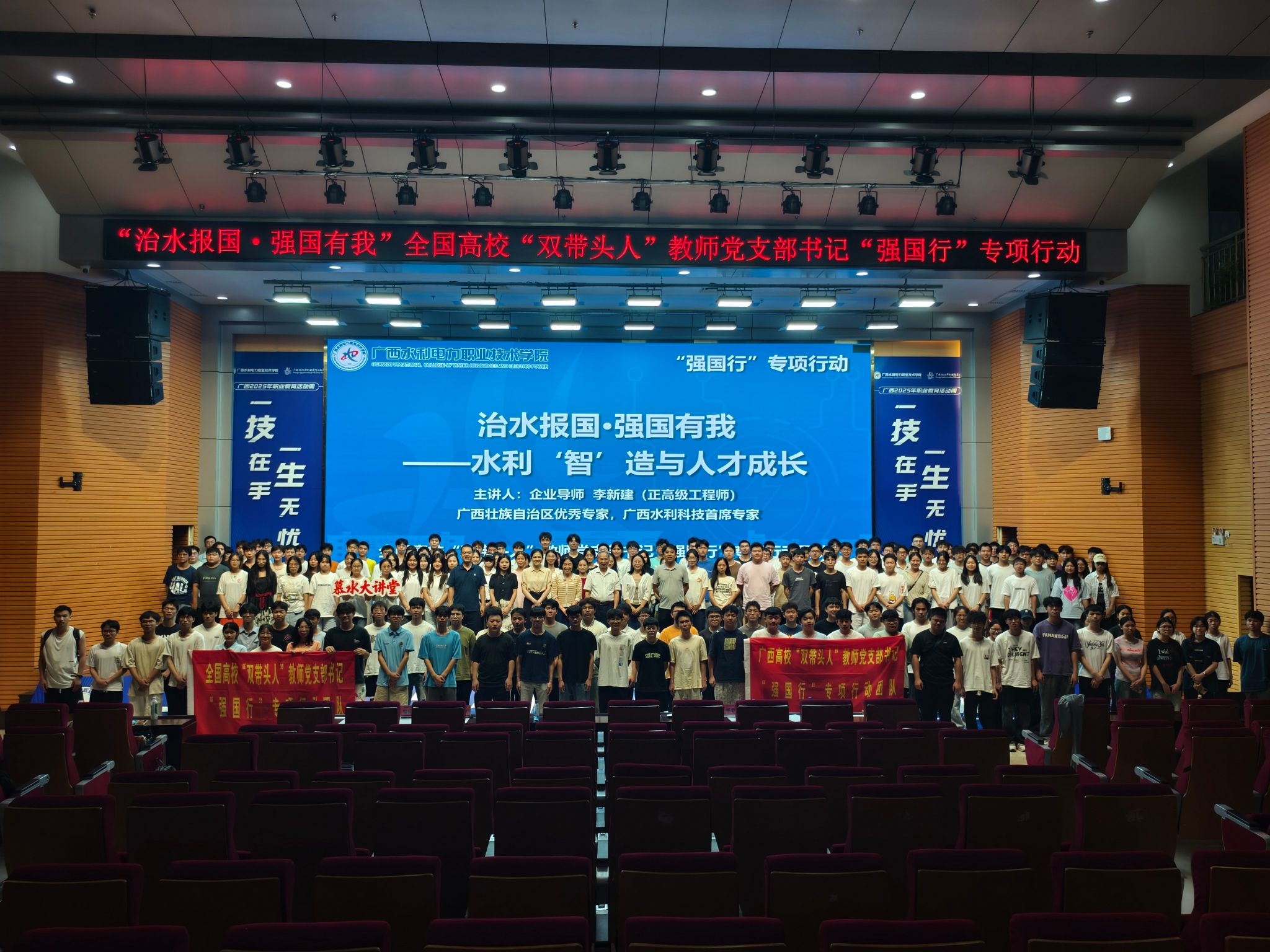 [本网讯]5月16日,水利工程学院教工第一党支部联合第二党支部开展全国高校“双带头人”教师党支部书记“强国行”专项行动,特邀广西壮族自治区优秀专家、广西水利科技首席专家李新建正高级工程师,为水利水电工程智能管理(基层水利人才定向)等300多名师生作了题为《水利“智”造与人才成长》的专题报告。本次活动由支部余金凤名师工作室、廖一帆博士工作室、张志玲博士工作室、慕水辅导员工作室承办,以“治水报国·强国有我”为主题,聚焦智慧水利前沿技术与新时代水利人才培养,为师生带来一场兼具学术高度与使命情怀的“强国行”实践课堂。