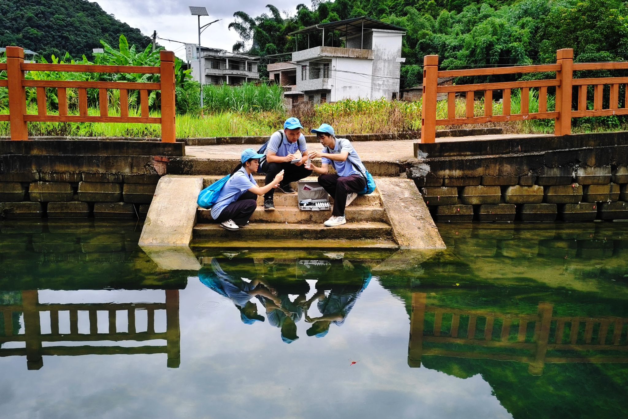 在驻村工作队的带领下,实践团实地巡护了毛潭村中小河流治理工程项目点,对河道环境进行了细致考察,并现场开展水质检测,确保村民用水安全。团队成员向村民普及了水环境保护的重要性,倡导大家共同守护“生命之源”,共建美丽家园。