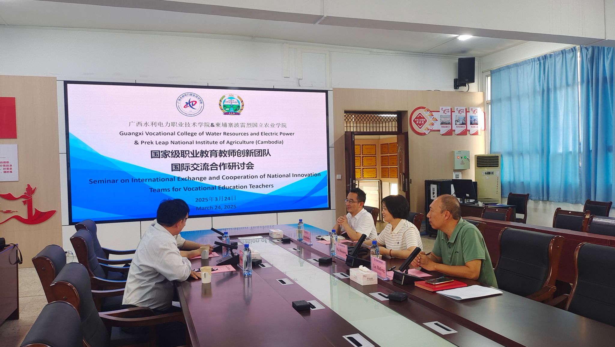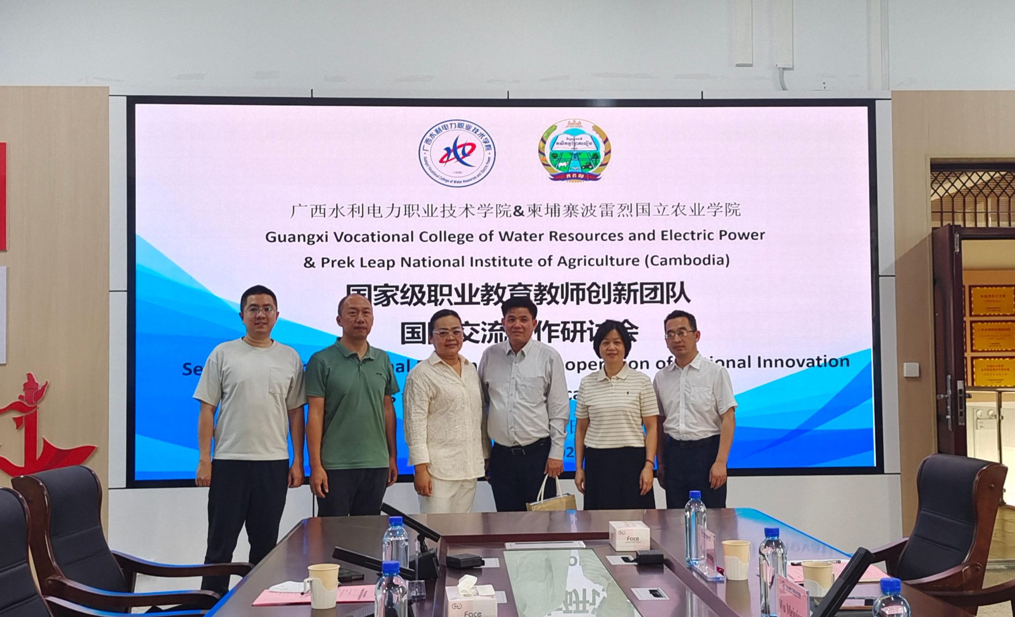 [本网讯]为做好国家级职业教育教师创新团队建设工作,3月24日下午,国家级职业教育教师创新团队在长堽校区召开国际交流合作研讨会。柬埔寨波雷烈国立农业学院研究生院副院长Khim Sathya应邀出席会议,国家级职业教育教师创新团队负责人、水利工程学院院长吴美琼携副院长刘志枫、张宪明等团队成员参加会议。
