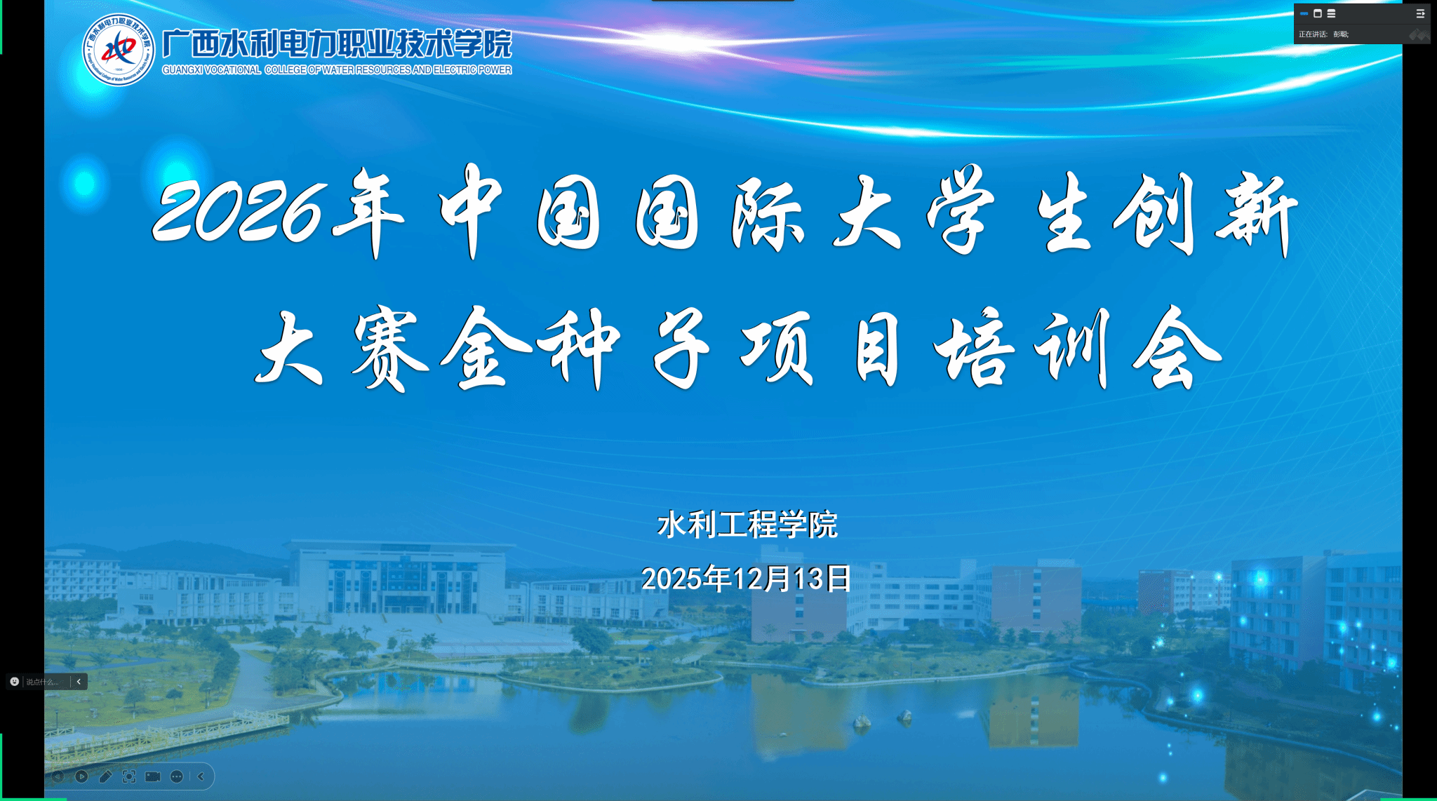 [本网讯]12月13日,水利工程学院组织召开2026年中国国际大学生创新大赛金种子项目线上培训会,学院副院长彭聪、各项目指导老师及团队成员参加会议。