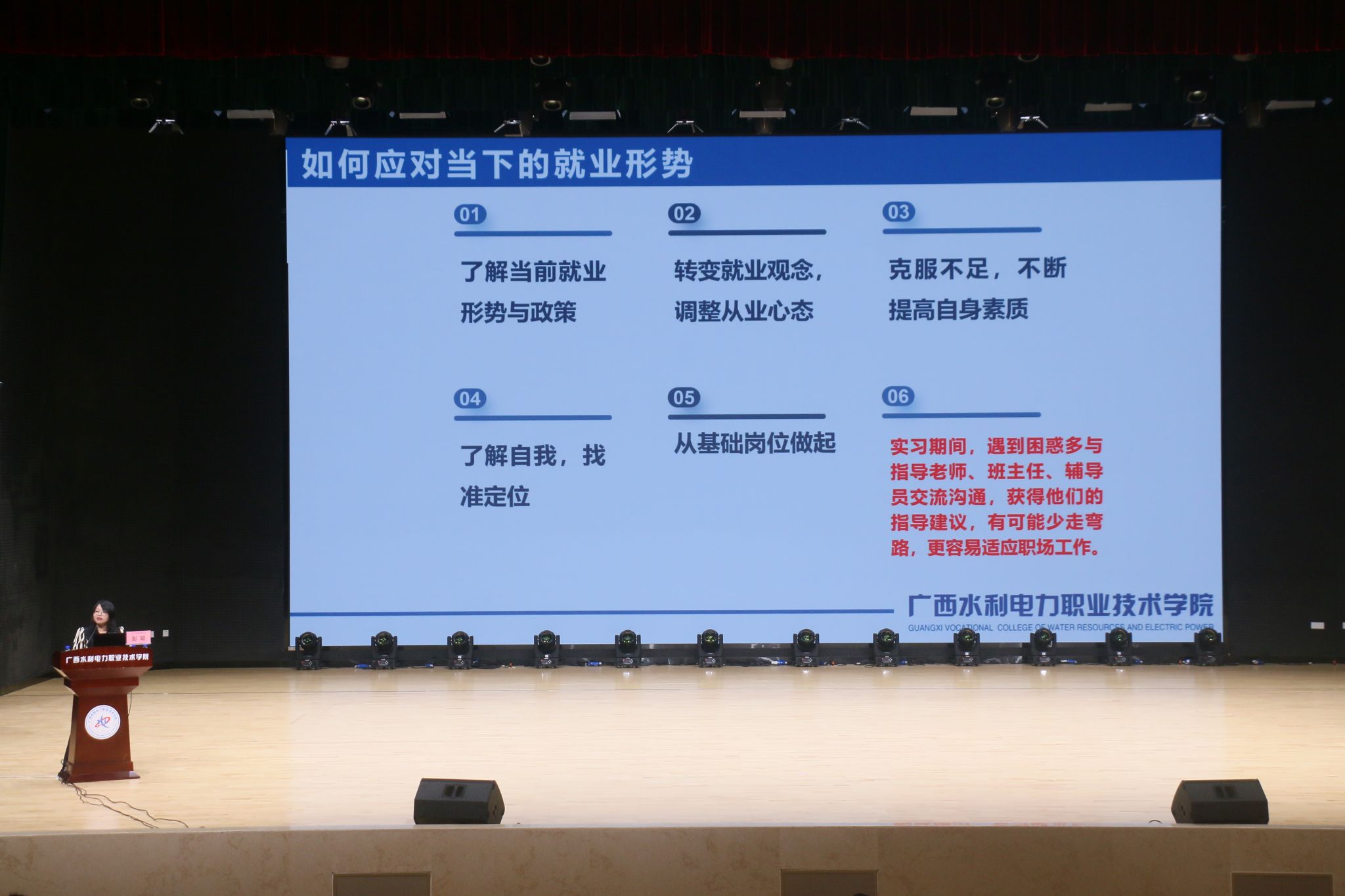 紧接着,学院副院长彭聪以“认识实习重要性、认清就业形势、积极应对挑战”为主题,结合详实数据分析了当前高校毕业生面临的就业形势,指出实习是实现顺利就业的重要桥梁。她提醒同学们要转变观念、增强岗位意识、积累社会经验,鼓励大家以积极心态迎接职场挑战。