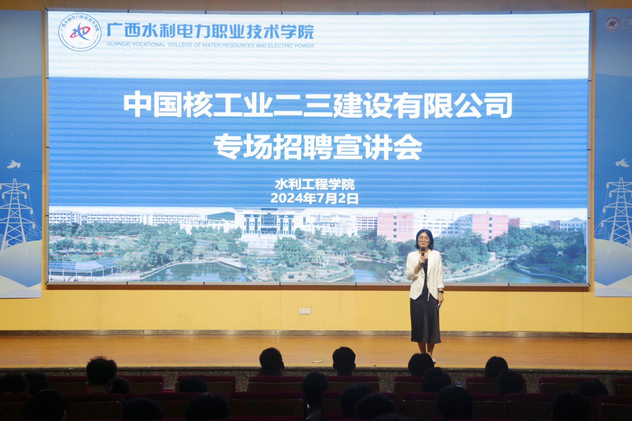 【本网讯】为学生提供优质的就业机会,满足日益增长的人才需求。7月2日,水利工程学院举办中国核工业二三建设有限公司简称中核二三“)专场招聘宣讲会。中国核工业二三建设有限公司招聘经理王家旺携相关负责人、各学院教师代表、毕业生代表参加宣讲会。宣讲会由招聘经理王家旺进行宣讲。