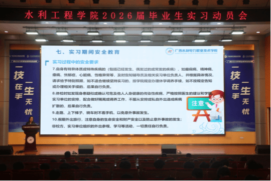 [本网讯]6月4日下午,水利工程学院在里建校区青年之家学术报告厅开展2023级毕业生实习动员会。水利工程学院党总支专职副书记李小莲,副院长彭聪,各专业负责人、班主任、辅导员、实习指导老师以及2023级学生参与本次动员会。