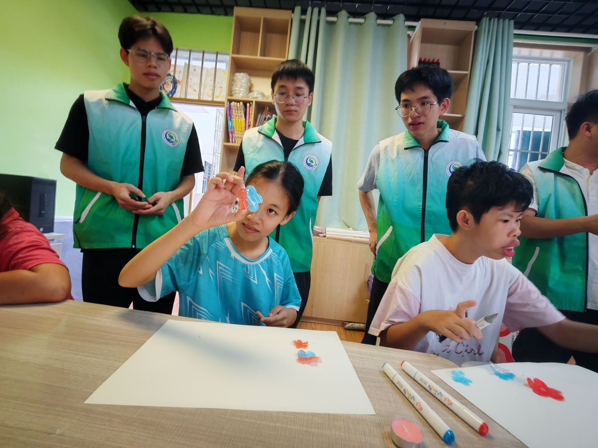 节水节能行动协会指导老师吴萍介绍了垃圾分类,塑料污染的危害及其转化价值,组织孩子们参加垃圾分类小游戏,用画笔描绘多彩花灯的美丽图形。项目负责人蓝天立同学(残疾大学生)讲解并演示塑锦艺品的制作过程。团队成员还准备了多种DIY工具,协助孩子们挑选自己喜爱的颜色,为花瓣上色、塑形、粘贴。在快乐融洽的气氛中,聋哑、智力障碍的孩子都独立制作出自己喜爱的塑料再生花,花朵与笑脸在这一刻共同绽放。